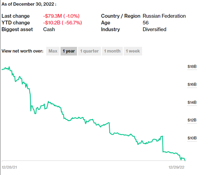 Το 2022 που βρίσκεται ένα βήμα πριν από την πόρτα της εξόδου, ήταν μια χρονιά η οποία για τους Ρώσους ολιγάρχες κόστισε πολλά. Οι κυρώσεις και το πάγωμα των περιουσιακών τους στοιχείων από τη Δύση ελέω της εισβολής της Ρωσίας στην Ουκρανία, διέγραψαν ούτε λίγο ούτε πολύ συνολικά 95 δισ. δολάρια από την προσωπική περιουσία των Ρώσων κροίσων όπως αναφέρει το Bloomberg, ή περί των 330 εκατ. δολαρίων την ημέρα.