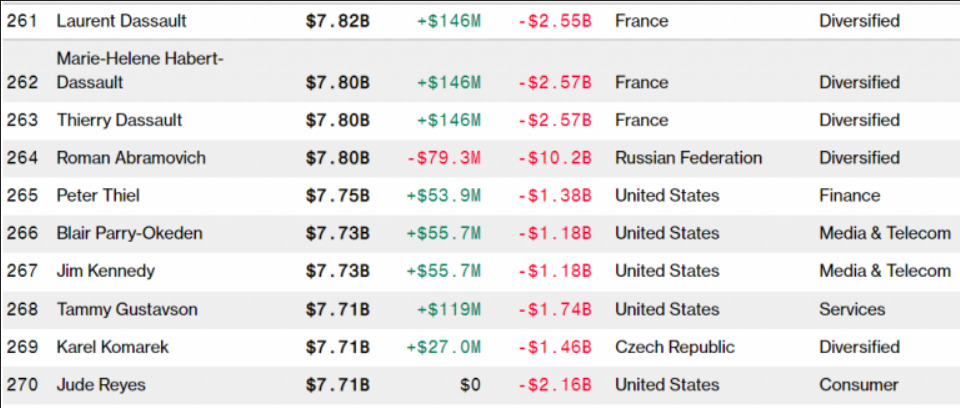 Εντούτοις, εκείνος που υπέφερε περισσότερο τη χρονιά που σε λίγο θα είναι παρελθόν, είναι ο Ρόμαν Αμπράμοβιτς ενώ και η καινούργια χρονιά αναμένεται να έχει ανάλογη συνέχεια. Σύμφωνα με το Bloomberg, ο πρώην ιδιοκτήτης του αγγλικού ποδοσφαιρικού συλλόγου Τσέλσι έχασε στη διάρκεια του 2022 περισσότερο από το ήμισυ της προσωπικής του περιουσίας, η οποία επί του παρόντος υπολογίζεται ότι έχει πέσει στα 7,80 δισ. δολάρια, με απώλειες της τάξεως των 10,2 δισ. δολαρίων από την αρχή του τρέχοντος έτους.