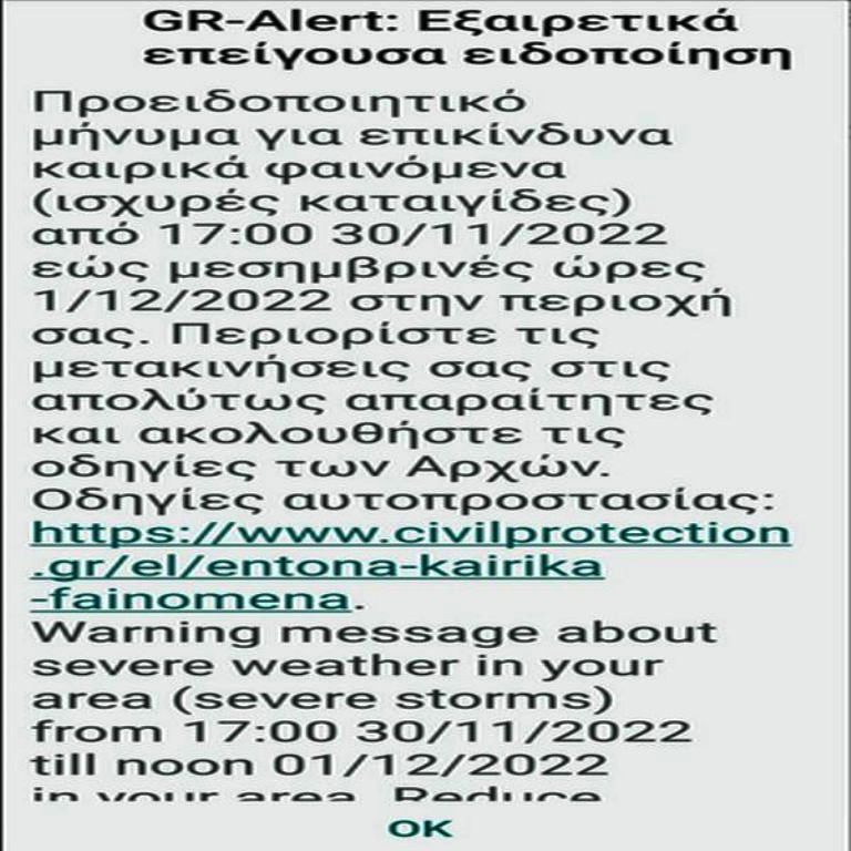 Προειδοποιητικό μήνυμα από το 112 της υπηρεσίας Πολιτικής Προστασίας του Υπουργείου Κλιματικής Κρίσης και Πολιτικής Προστασίας, έλαβαν οι κάτοικοι του νομού Χαλκιδικής, αργά το απόγευμα της Τετάρτης 30 Νοεμβρίου.