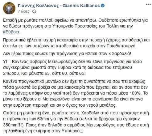 «Οπότε μη ρωτάτε εμένα, ρωτήστε τον κ. Χαρδαλιά από που προέκυψε αυτή η πρόγνωση των 63mm για την Εύβοια (τελικά τα βροχόμετρα έγραψαν 350mm!!!). Ποιος ήταν δηλαδή ο αρμόδιος Μετεωρολόγος που έδωσε αυτή τη λανθασμένη εκτίμηση στον Υπουργό;;;».