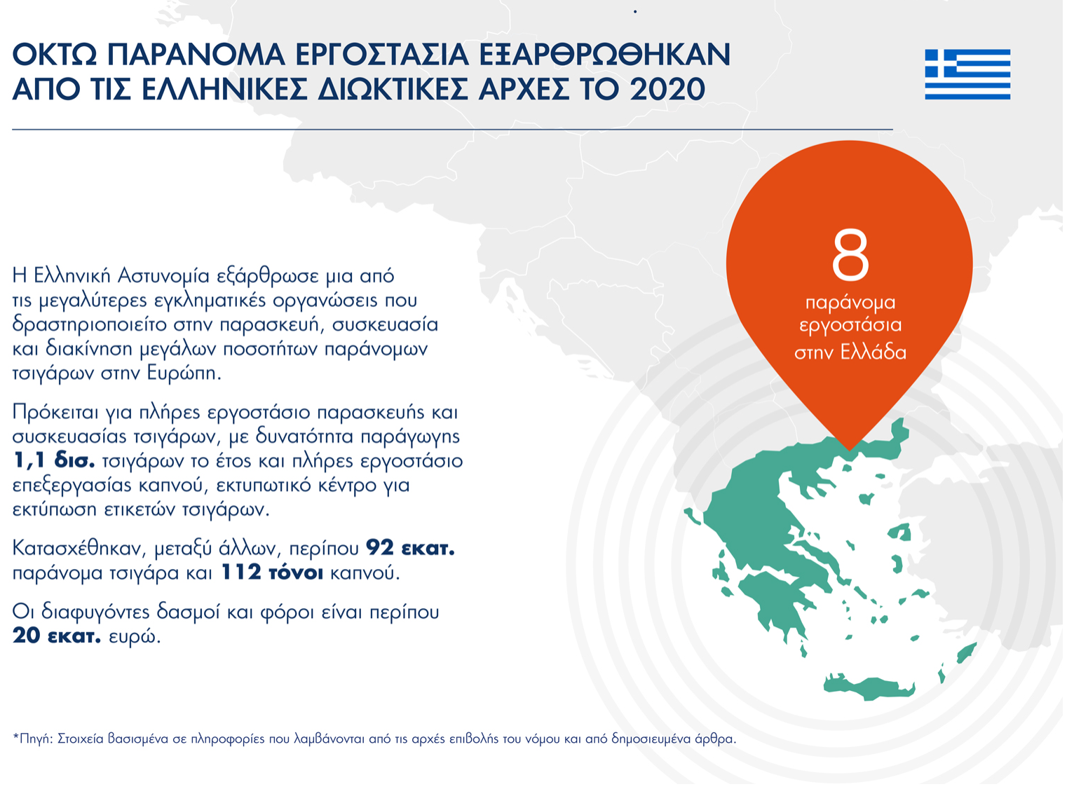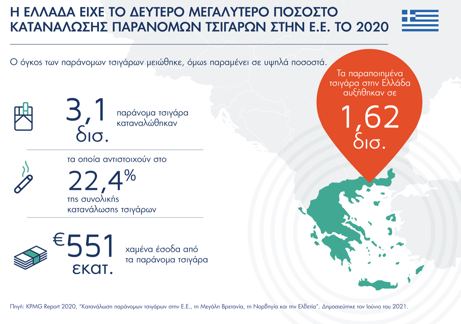 H παράνομη αγορά τσιγάρων στην Ελλάδα το 2020 βρίσκεται στο 22,4%, ελαφρώς μειωμένη, με τις απώλειες των κρατικών ταμείων να ανέρχονται στα 551 εκατ. ευρώ το 2020 (σε σχέση με 610 εκατ. ευρώ το 2019).