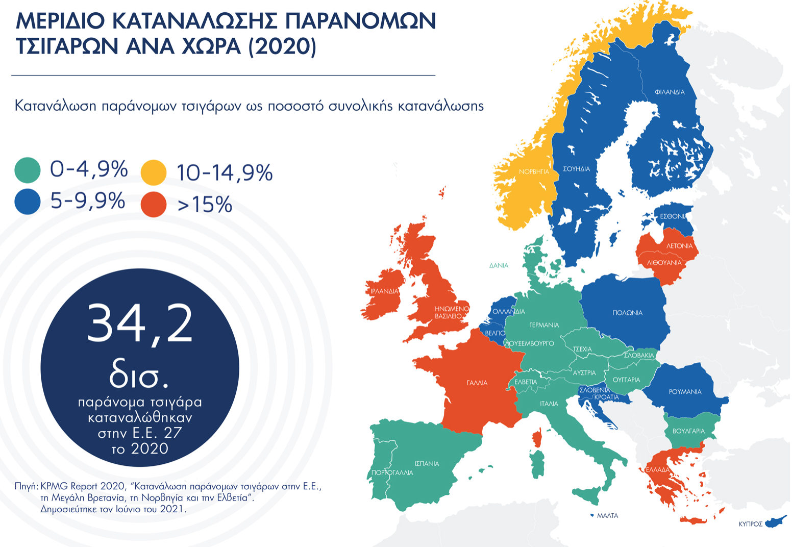 Η Γαλλία γίνεται η χώρα με το υψηλότερο ποσοστό παράνομων τσιγάρων (23,1%) σημειώνοντας τεράστια αύξηση στην κατανάλωση παραποιημένων τσιγάρων μέσα στο 2020, η οποία ξεπέρασε το 600%. Ακολουθεί η Ελλάδα με 22,4% και η Λιθουανία με 20,2%. Αντίθετα, η Ρουμανία ήταν η χώρα που παρουσίασε την μεγαλύτερη μείωση κατανάλωσης παράνομων τσιγάρων κατά 1,3 δισ.