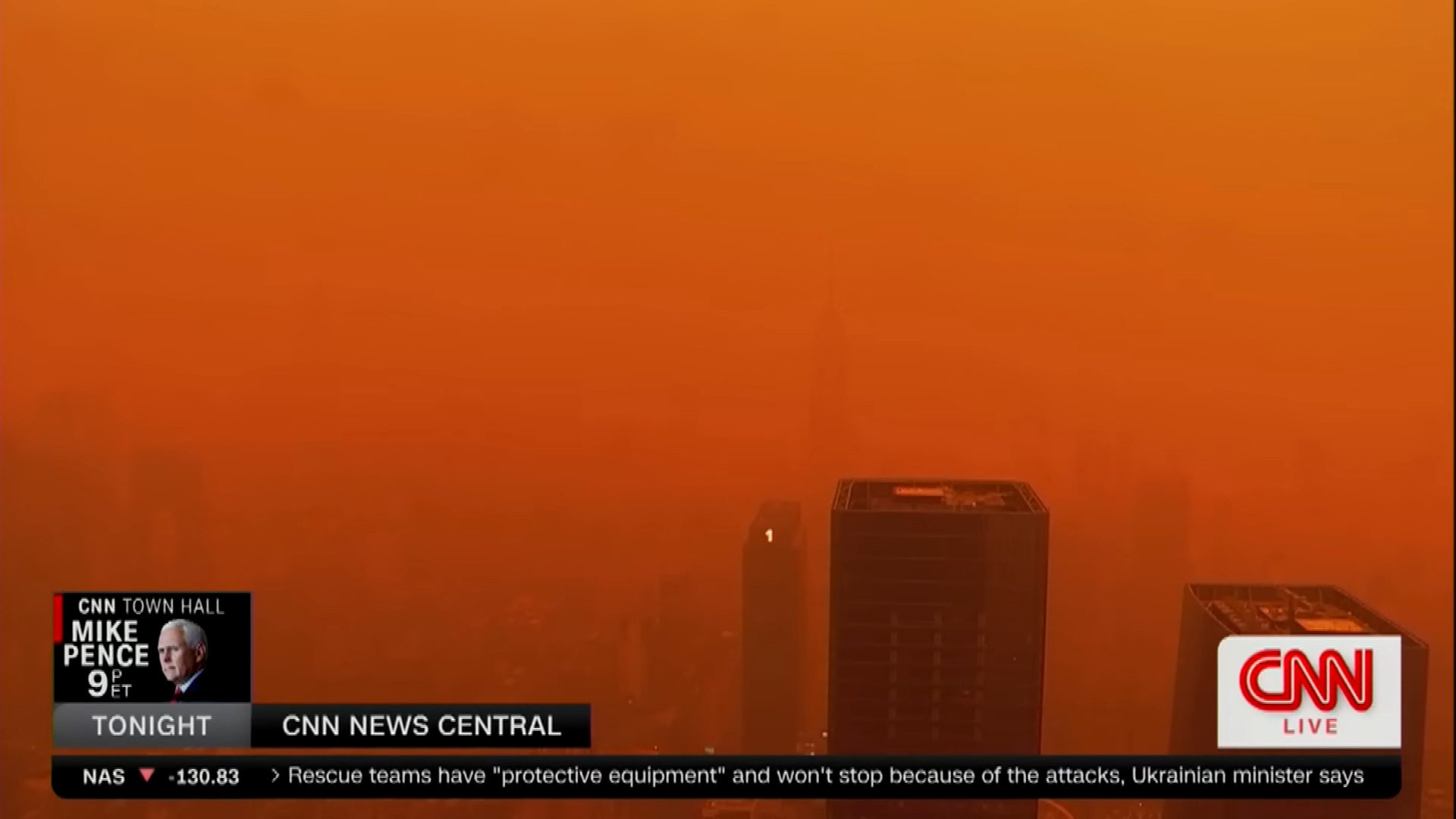 Μια δυστοπική πορτοκαλί ομίχλη από καπνό και αιθαλομίχλη έχει καλύψει τη Νέα Υόρκη, κάνοντας το τοπίο να μοιάζει βγαλμένο από ταινία επιστημονικής φαντασίας. Αιτία οι δασικές φωτιές που συνεχίζουν να καίνε σε όλο τον Καναδά, αναγκάζοντας χιλιάδες ανθρώπους να εγκαταλείψουν τα σπίτια τους και εκπέμποντας ένα τοξικό πέπλο καπνού προς τις πόλεις των ΗΠΑ.