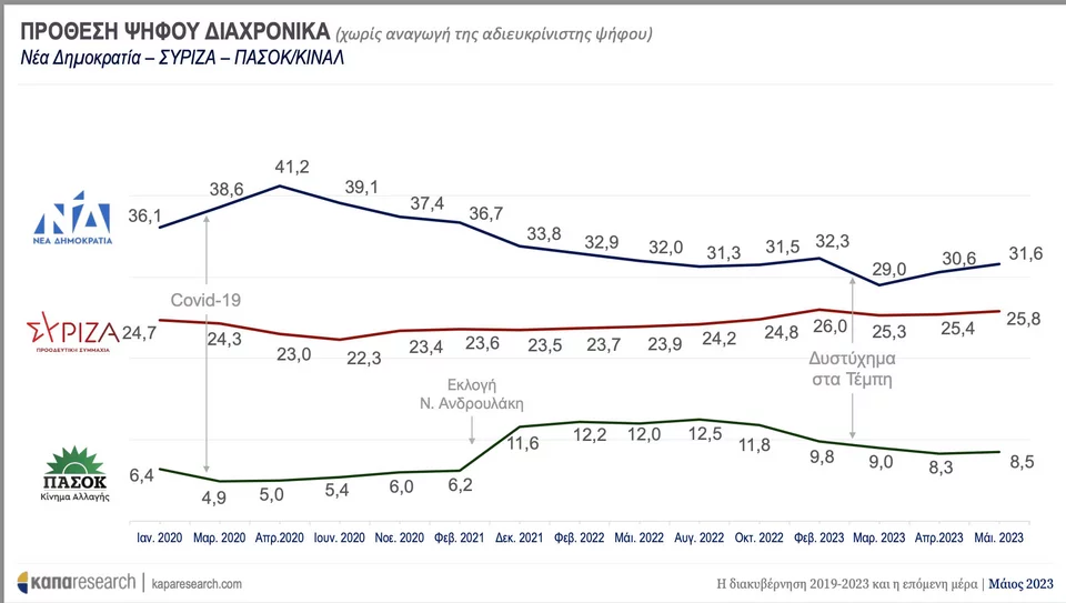 Επιπλέον, το μέχρι τότε υπό διαμόρφωση προεκλογικό κλίμα επηρεάστηκε καταλυτικά από το δυστύχημα των Τεμπών, το οποίο δίπλα στις ευθύνες της κυβέρνησης ανέδειξε συνολικά τις διαχρονικές παθογένειες του κράτους και του πολιτικού συστήματος, παγώνοντας την κοινωνία και καθηλώνοντας εν μια νυκτί την όποια επικοινωνιακή ορμή κομμάτων και φανατικών υποστηρικτών.