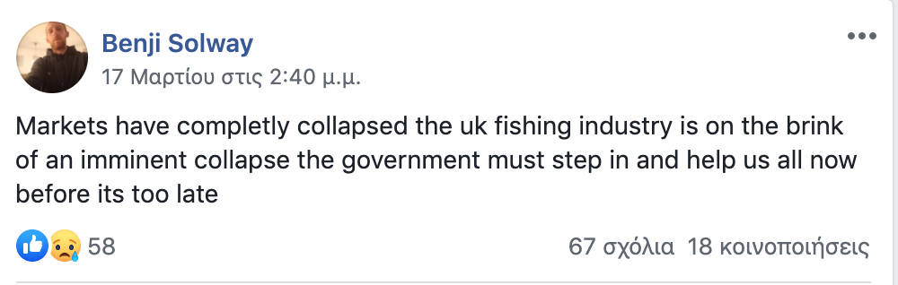 Ο Gaurdian σε ρεπορτάζ του αναφέρει την οικονομική καταστροφή των Βρετανών ψαράδων καθώς πληρώματα σε χιλιάδες καϊκια βρίσκονται ακινητοποιημένα σε όλο το Ηνωμένο Βασίλειο. Δραματικές αναρτήσεις γίνονται σε σελίδες των social media.