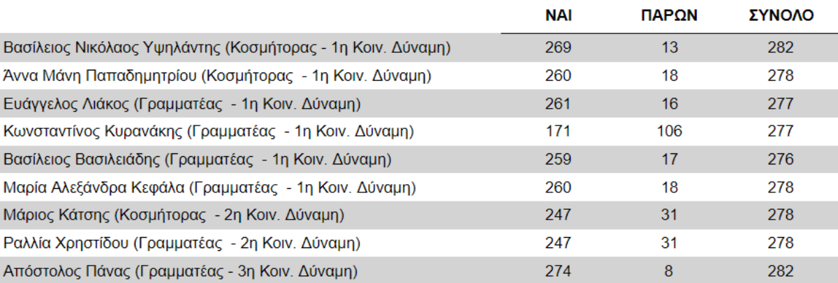 Τα αποτελέσματα της ονομαστικής ψηφοφορίας που διεξήχθη έχουν ως εξής: