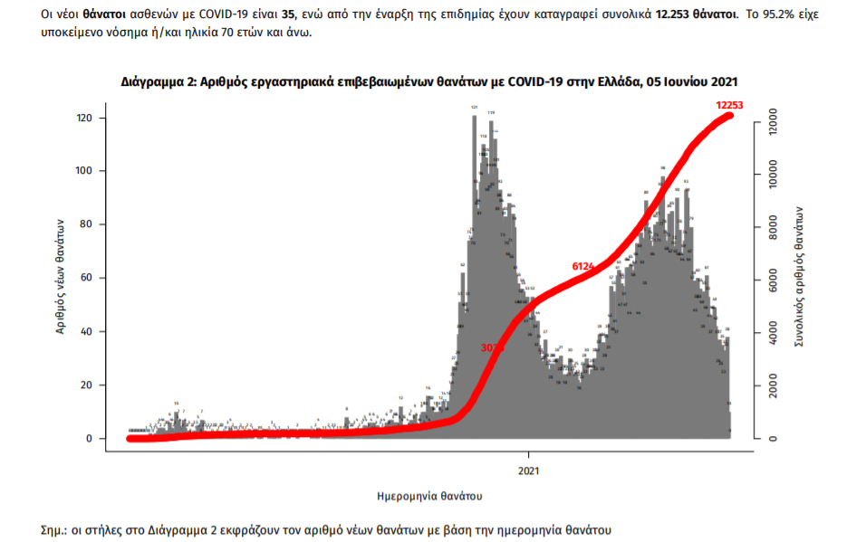 Οι νέοι θάνατοι ασθενών με COVID-19 είναι 35, ενώ από την έναρξη της επιδημίας έχουν καταγραφεί συνολικά 12.253 θάνατοι. Το 95.2% είχε υποκείμενο νόσημα ή/και ηλικία 70 ετών και άνω.