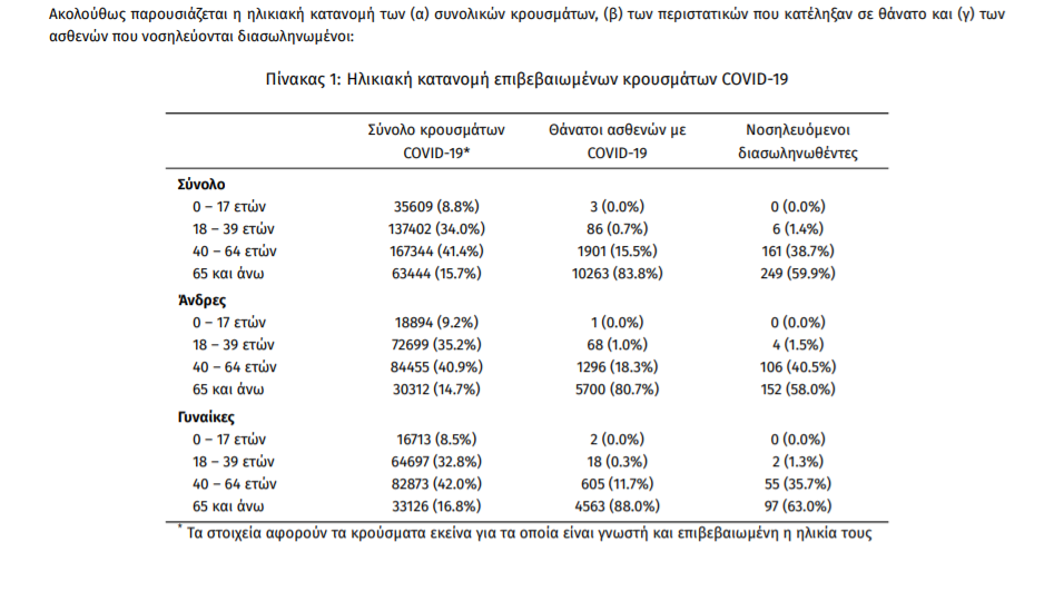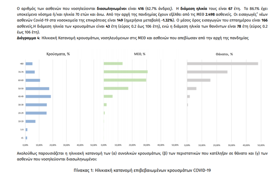 Ο αριθμός των ασθενών που νοσηλεύονται διασωληνωμένοι είναι 416 (62.7% άνδρες). Η διάμεση ηλικία τους είναι 67 έτη. To 86.1% έχει υποκείμενο νόσημα ή/και ηλικία 70 ετών και άνω. Από την αρχή της πανδημίας έχουν εξέλθει από τις ΜΕΘ 2.498 ασθενείς. Οι εισαγωγές1 νέων ασθενών Covid-19 στα νοσοκομεία της επικράτειας είναι 149 (ημερήσια μεταβολή -1.32%). Ο μέσος όρος εισαγωγών του επταημέρου είναι 166 ασθενείς.Η διάμεση ηλικία των κρουσμάτων είναι 43 έτη (εύρος 0.2 έως 106 έτη), ενώ η διάμεση ηλικία των θανόντων είναι 78 έτη (εύρος 0.2 έως 106 έτη)