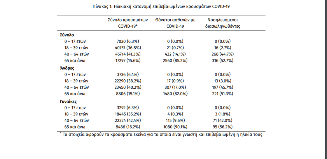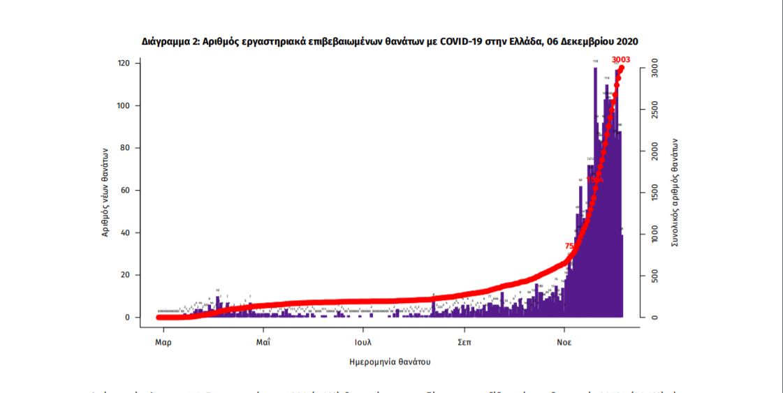 Τέλος, έχουμε 101 ακόμα καταγεγραμμένους θανάτους και 3003 θανάτους συνολικά στη χώρα. 1197 (39.9%) γυναίκες και οι υπόλοιποι άνδρες. Η διάμεση ηλικία των θανόντων συμπολιτών μας ήταν τα 79 έτη και το 96.2% είχε κάποιο υποκείμενο νόσημα ή/και ηλικία 70 ετών και άνω.