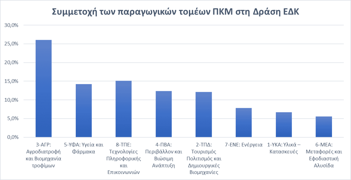 - Σε αντιστοιχία με τον αριθμό συμμετοχών, ο τομέας – πρωταθλητής της Αγροδιατροφής βρίσκεται αυτήν την περίοδο στην υλοποίηση του 22% του συνόλου των εγκεκριμένων προτάσεων της Δράσης ΕΔΚ στην Περιφέρεια Κεντρικής Μακεδονίας και ακολουθεί ο τομέας των Τεχνολογιών Πληροφορικής και Επικοινωνιών (ΤΠΕ) στην υλοποίηση του 19% των ερευνητικών έργων.