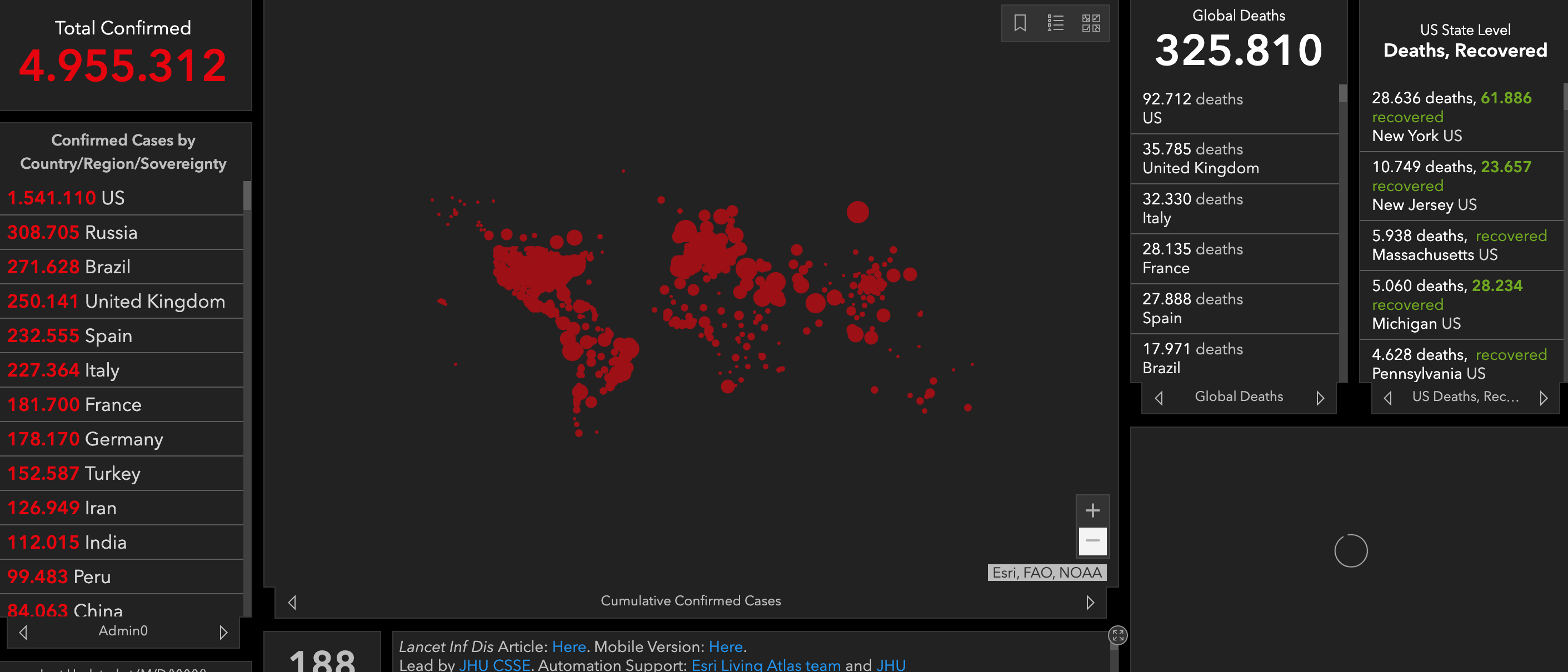 Από χθες μέχρι σήμερα, αναφέρθηκαν παγκοσμίως 4.951 νέοι θάνατοι και 94.820 νέα κρούσματα. Οι χώρες όπου καταγράφηκαν οι περισσότεροι θάνατοι μέσα στο τελευταίο 24ωρο είναι οι ΗΠΑ (1.404), η Βραζιλία (1.179) και το Ηνωμένο Βασίλειο (363).