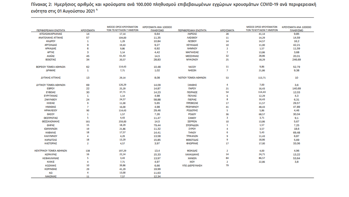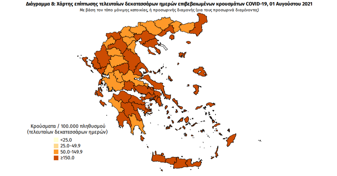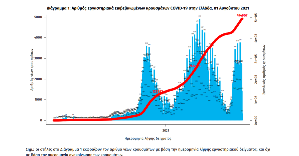 Τα νέα εργαστηριακά επιβεβαιωμένα κρούσματα της νόσου που καταγράφηκαν τις τελευταίες 24 ώρες είναι 1.605 , εκ των οποίων 12 εντοπίστηκαν κατόπιν ελέγχων στις πύλες εισόδου της χώρας. Ο συνολικός αριθμός των κρουσμάτων ανέρχεται σε 494.907 (ημερήσια μεταβολή +0.3%), εκ των οποίων 51.2% άνδρες. 1 Με βάση τα επιβεβαιωμένα κρούσματα των τελευταίων 7 ημερών, 155 θεωρούνται σχετιζόμενα με ταξίδι από το εξωτερικό και 1.806 είναι σχετιζόμενα με ήδη γνωστό κρούσμα.