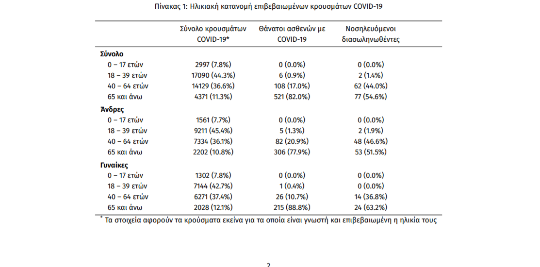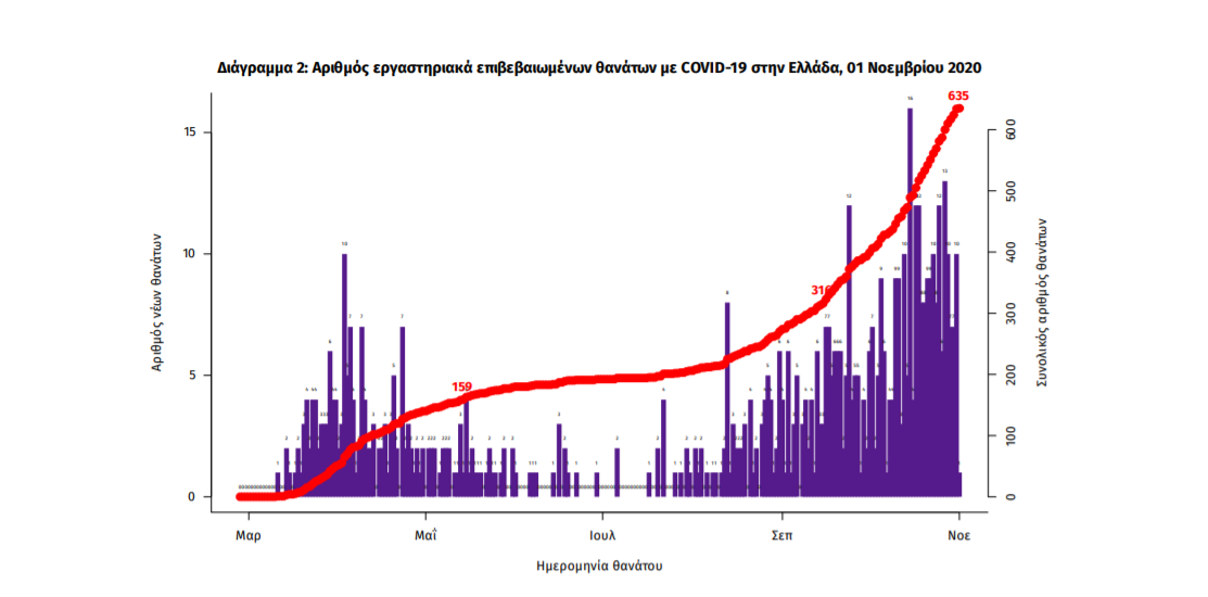 Τέλος, έχουμε 9 ακόμα καταγεγραμμένους θανάτους και 635 θανάτους συνολικά στη χώρα. 241 (38.0%) γυναίκες και οι υπόλοιποι άνδρες. Η διάμεση ηλικία των θανόντων συμπολιτών μας ήταν τα 79 έτη και το 96.2% είχε κάποιο υποκείμενο νόσημα ή/και ηλικία 70 ετών και άνω.