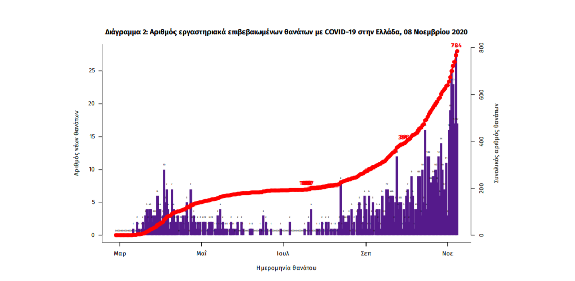 Τέλος, έχουμε 35 ακόμα καταγεγραμμένους θανάτους και 784 θανάτους συνολικά στη χώρα. 316 (40.3%) γυναίκες και οι υπόλοιποι άνδρες. Η διάμεση ηλικία των θανόντων συμπολιτών μας ήταν τα NA έτη και το 96.4% είχε κάποιο υποκείμενο νόσημα ή/και ηλικία 70 ετών και άνω.