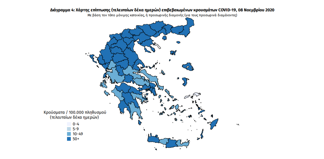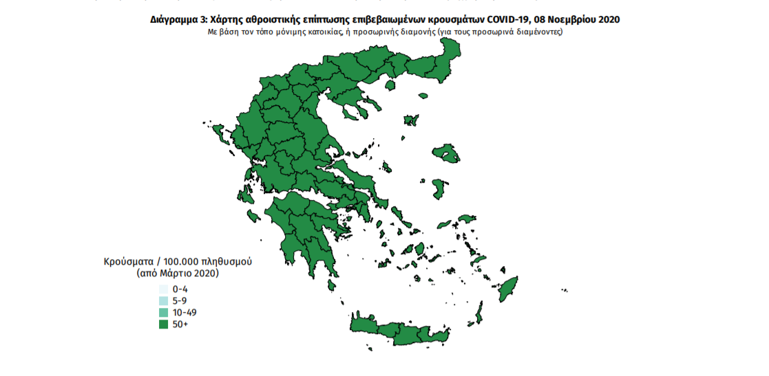 4429 (7.8%) θεωρούνται σχετιζόμενα με ταξίδι από το εξωτερικό και 15678 (27.7%) είναι σχετιζόμενα με ήδη γνωστό κρούσμα.