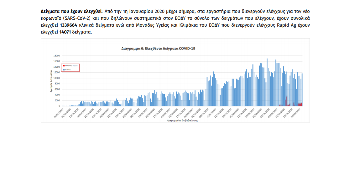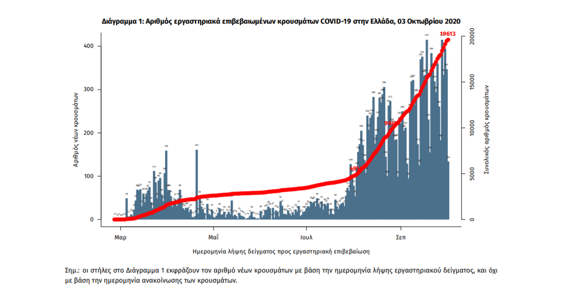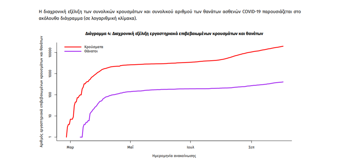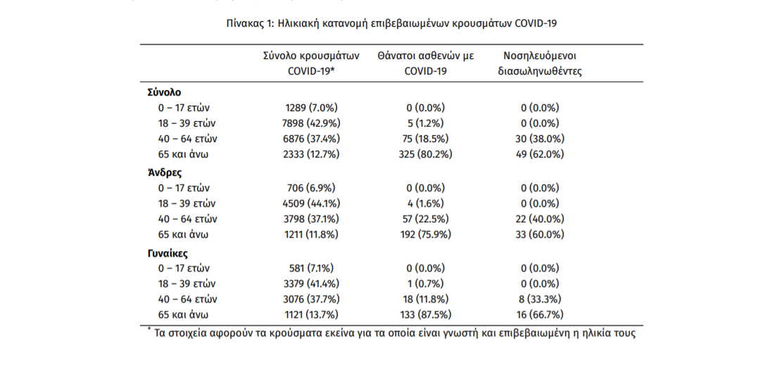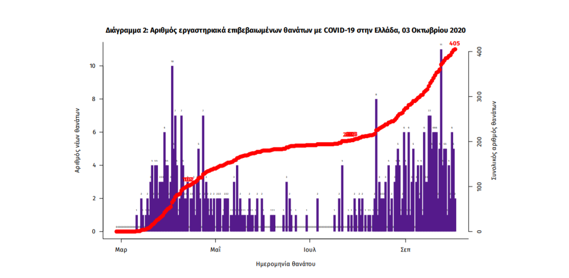 Τέλος, έχουμε 7 ακόμα καταγεγραμμένους θανάτους και 405 θανάτους συνολικά στη χώρα. 152 (37.5%) γυναίκες και οι υπόλοιποι άνδρες. Η διάμεση ηλικία των θανόντων συμπολιτών μας ήταν τα 78 έτη και το 96.3% είχε κάποιο υποκείμενο νόσημα ή/και ηλικία 70 ετών και άνω.