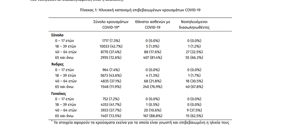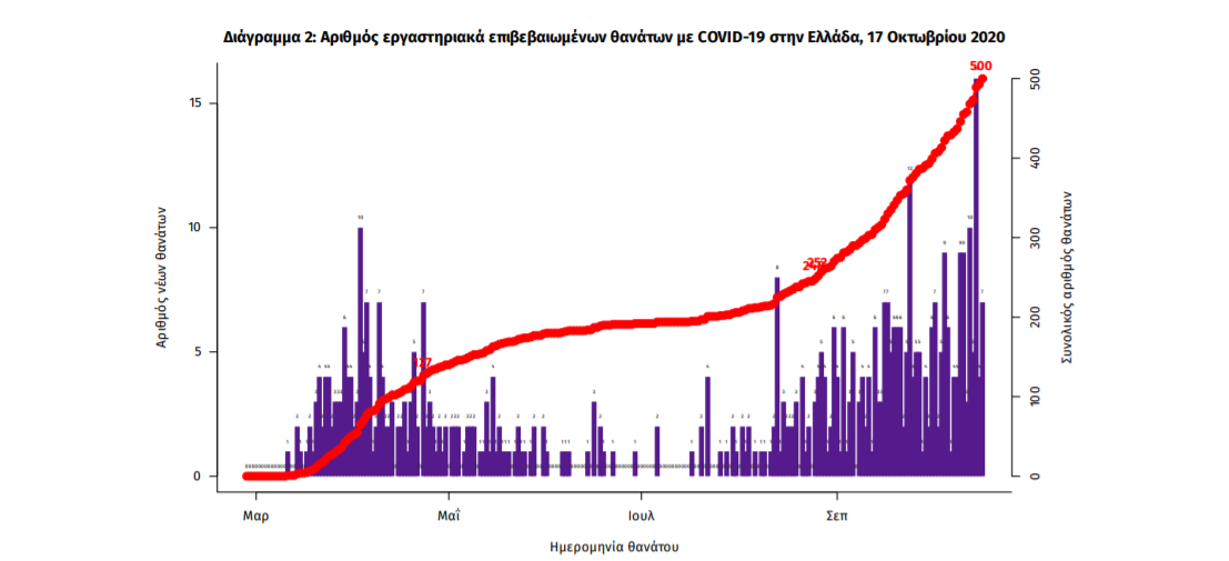 Τέλος, έχουμε 10 ακόμα καταγεγραμμένους θανάτους και 500 θανάτους συνολικά στη χώρα. 188 (37.6%) γυναίκες και οι υπόλοιποι άνδρες. Η διάμεση ηλικία των θανόντων συμπολιτών μας ήταν τα 79 έτη και το 96.2% είχε κάποιο υποκείμενο νόσημα ή/και ηλικία 70 ετών και άνω.