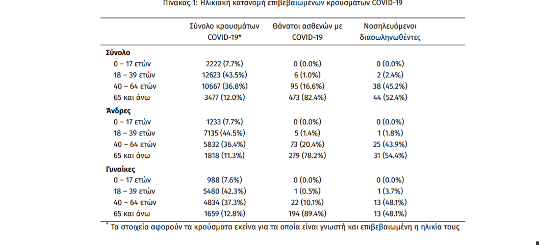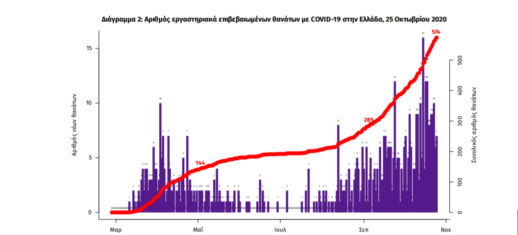 Τέλος, έχουμε 10 ακόμα καταγεγραμμένους θανάτους και 574 θανάτους συνολικά στη χώρα. 217 (37.8%) γυναίκες και οι υπόλοιποι άνδρες. Η διάμεση ηλικία των θανόντων συμπολιτών μας ήταν τα 79 έτη και το 96.3% είχε κάποιο υποκείμενο νόσημα ή/και ηλικία 70 ετών και άνω.