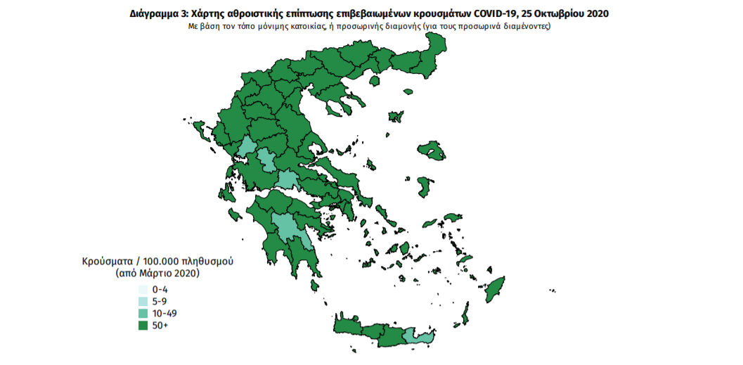 3862 (12.5%) θεωρούνται σχετιζόμενα με ταξίδι από το εξωτερικό και 11724 (38.1%) είναι σχετιζόμενα με ήδη γνωστό κρούσμα.