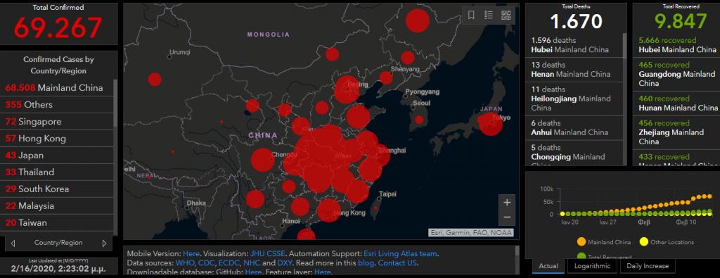 Σύμφωνα με τα πιο πρόσφατα στοιχεία, στην ηπειρωτική Κίνα έχουν σημειωθεί 68.500 κρούσματα του ιού και 1.665 θάνατοι. Σε άλλες χώρες ο αριθμός αυτός είναι περίπου 500 κρούσματα, σε σχεδόν 24 χώρες και εδάφη, με 4 θανάτους σε Ιαπωνία, Χονγκ Κονγκ, Φιλιππίνες και Γαλλία.
