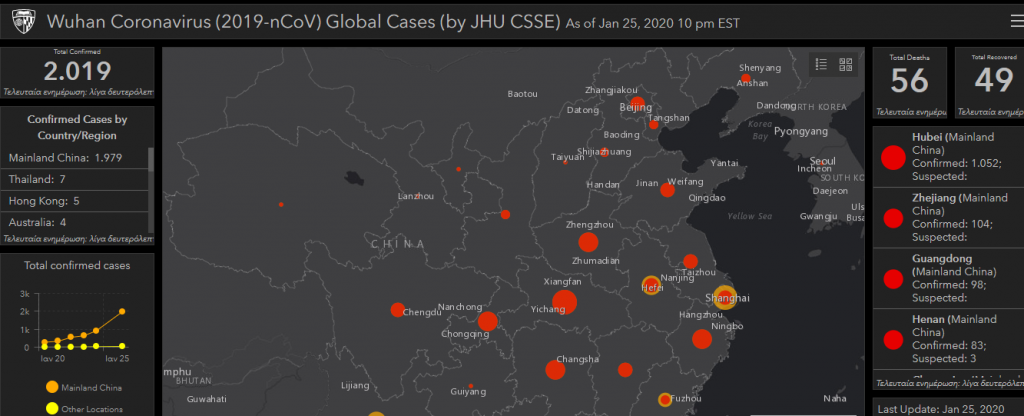 Σήμερα, η Κίνα επιβεβαίωσε 1.975 περιπτώσεις ασθενών που έχουν μολυνθεί από τον νέο κοροναϊό έως τις 25 Ιανουαρίου, ενώ ο αριθμός των νεκρών έχει ανέλθει στους 56, όπως μετέδωσε το κρατικό δίκτυο CCTV.