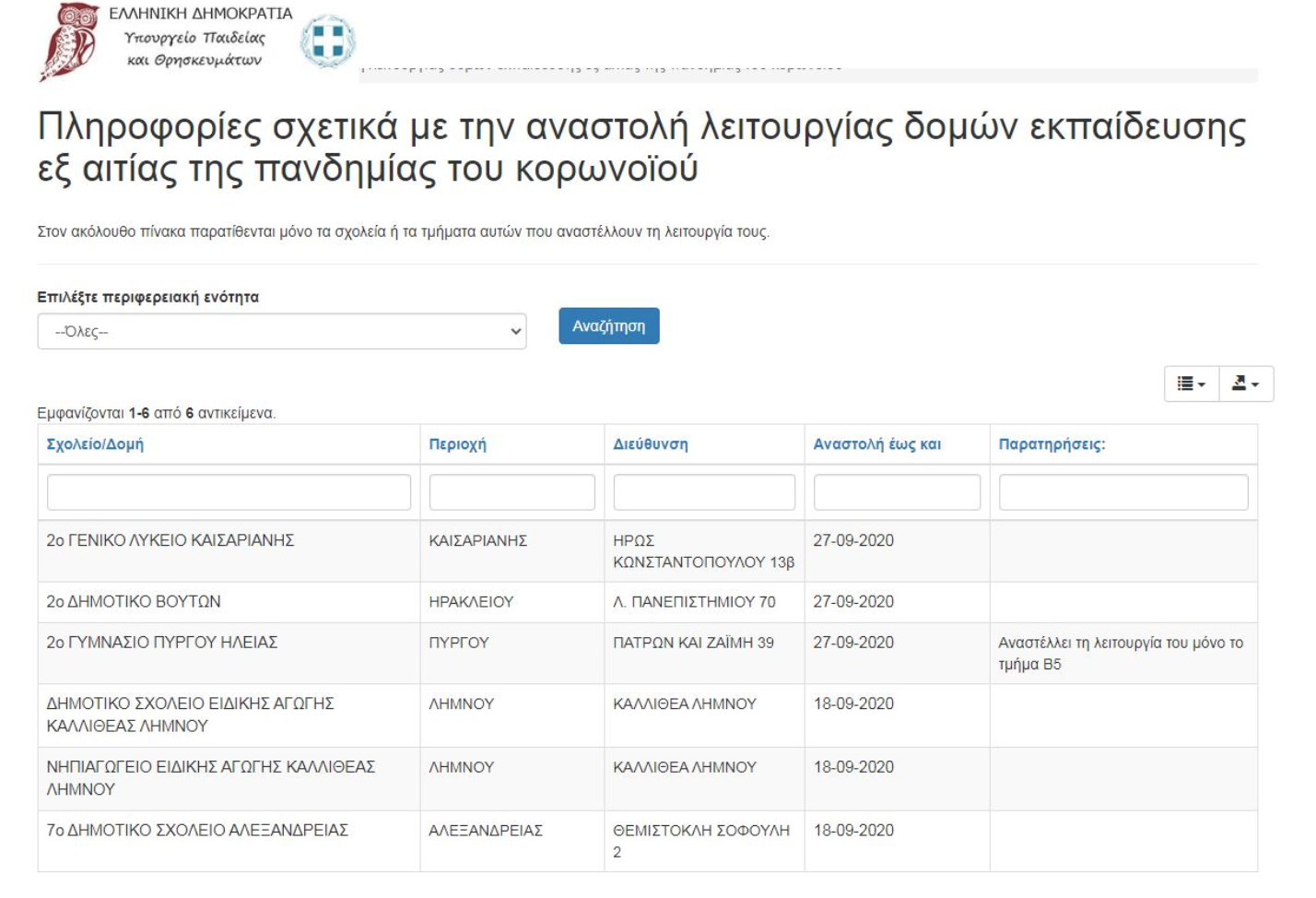 Σύμφωνα με σημερινά στοιχεία (16/9) του υπουργείου Παιδείας, κλειστά λόγω κορωνοϊού είναι τα ακόλουθα σχολεία μέχρι τις ημερομηνίες που αναγράφονται.