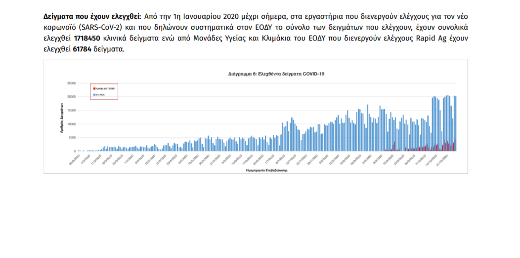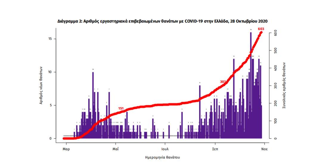 Τέλος, έχουμε 10 ακόμα καταγεγραμμένους θανάτους και 603 θανάτους συνολικά στη χώρα. 228 (37.8%) γυναίκες και οι υπόλοιποι άνδρες. Η διάμεση ηλικία των θανόντων συμπολιτών μας ήταν τα 79 έτη και το 96.2% είχε κάποιο υποκείμενο νόσημα ή/και ηλικία 70 ετών και άνω.