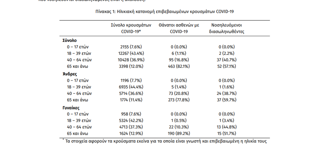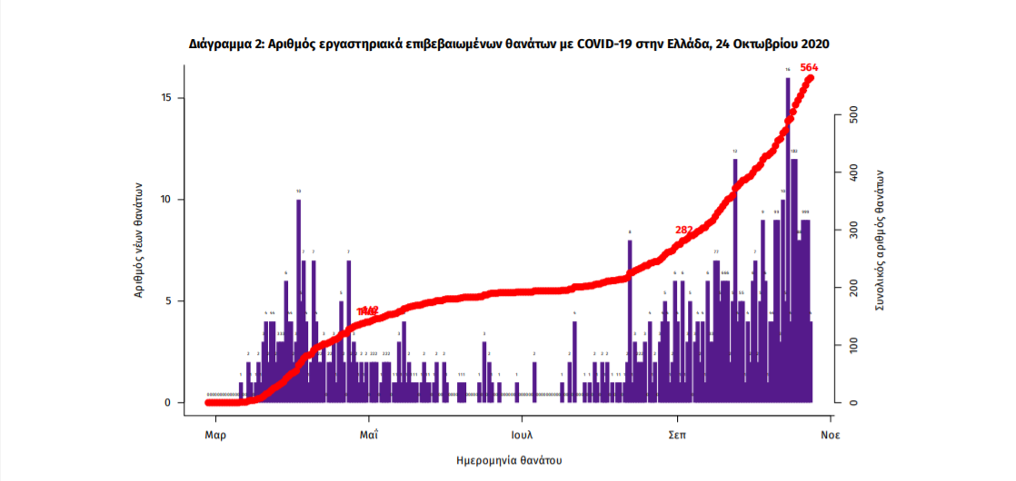 Τέλος, έχουμε 5 ακόμα καταγεγραμμένους θανάτους και 564 θανάτους συνολικά στη χώρα. 213 (37.8%) γυναίκες και οι υπόλοιποι άνδρες. Η διάμεση ηλικία των θανόντων συμπολιτών μας ήταν τα 79 έτη και το 96.3% είχε κάποιο υποκείμενο νόσημα ή/και ηλικία 70 ετών και άνω.