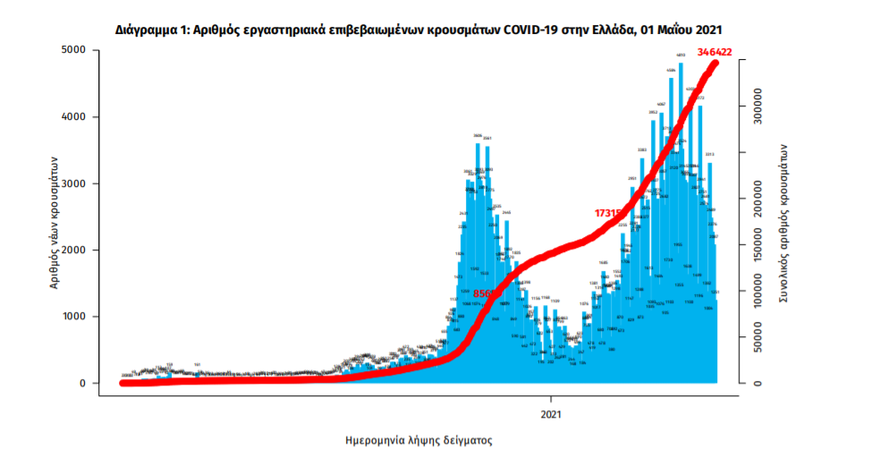 Τα νέα εργαστηριακά επιβεβαιωμένα κρούσματα της νόσου που καταγράφηκαν τις τελευταίες 24 ώρες είναι 1.391, εκ των οποίων 2 εντοπίστηκαν κατόπιν ελέγχων στις πύλες εισόδου της χώρας. Ο συνολικός αριθμός των κρουσμάτων ανέρχεται σε 346.422 (ημερήσια μεταβολή +0.4%), εκ των οποίων 51.3% άνδρες. 1 Με βάση τα επιβεβαιωμένα κρούσματα των τελευταίων 7 ημερών, 41 θεωρούνται σχετιζόμενα με ταξίδι από το εξωτερικό και 1.999 είναι σχετιζόμενα με ήδη γνωστό κρούσμα.