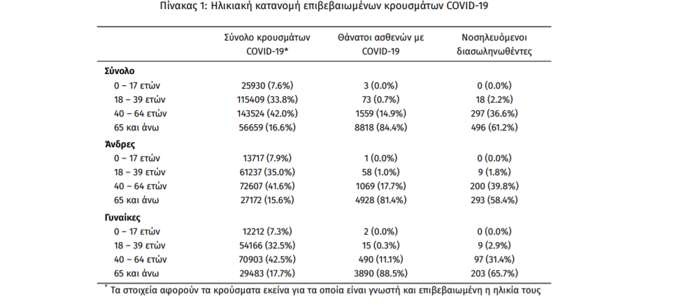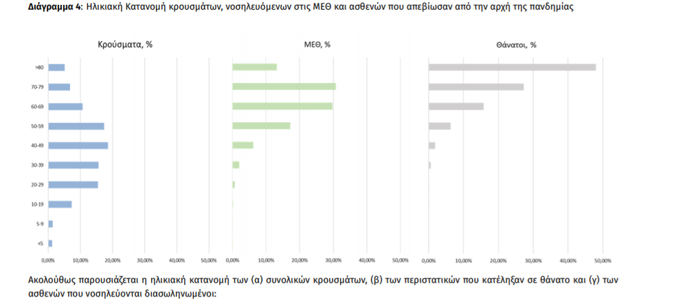 Ο αριθμός των ασθενών που νοσηλεύονται διασωληνωμένοι είναι 811 (62.0% άνδρες). Η διάμεση ηλικία τους είναι 68 έτη. To 84.1% έχει υποκείμενο νόσημα ή/και ηλικία 70 ετών και άνω. Από την αρχή της πανδημίας έχουν εξέλθει από τις ΜΕΘ 2.124 ασθενείς. Οι εισαγωγές2 νέων ασθενών Covid-19 στα νοσοκομεία της επικράτειας είναι 419 (ημερήσια μεταβολή 0%). Ο μέσος όρος εισαγωγών του επταημέρου είναι 450 ασθενείς.Η διάμεση ηλικία των κρουσμάτων είναι 44 έτη (εύρος 0.2 έως 106 έτη), ενώ η διάμεση ηλικία των θανόντων είναι 78 έτη (εύρος 0.2 έως 106 έτη)