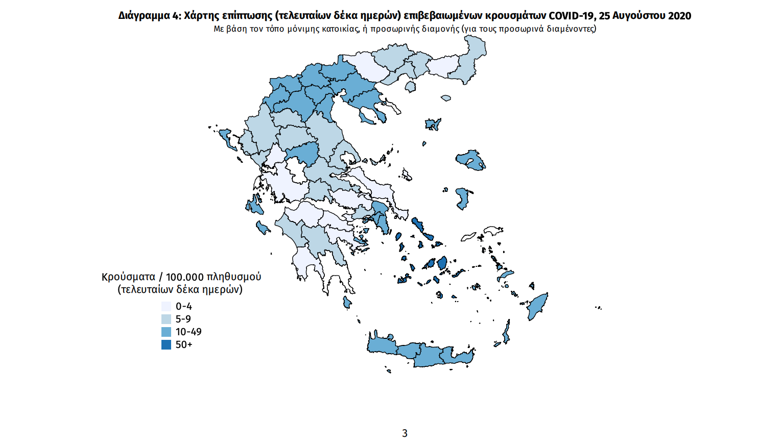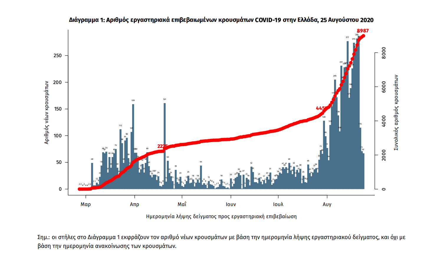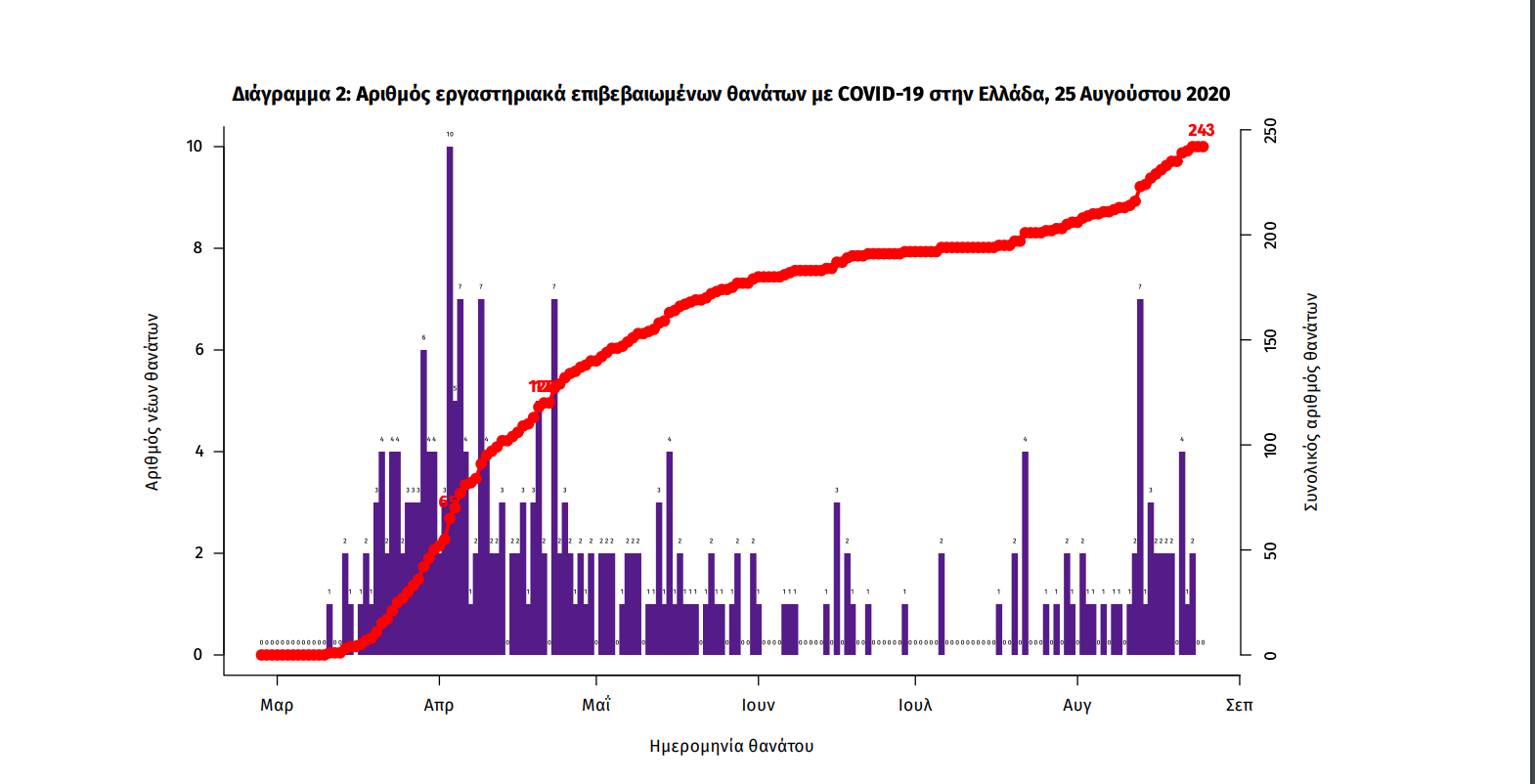 Τα στοιχεία που παρουσιάζονται αφορούν περιστατικά από την επιδημιολογική επιτήρηση της νόσου από το νέο κορωνοϊό (COVID19), με βάση τα δεδομένα που έχουν δηλωθεί στον ΕΟΔΥ και καταγραφεί μέχρι τις 25 Αυγούστου 2020 (ώρα 15:00). Τα νέα εργαστηριακά επιβεβαιωμένα κρούσματα της νόσου είναι 168, εκ των οποίων τα 20 εντοπίστηκαν κατόπιν ελέγχων στις πύλες εισόδου της χώρας. Ο συνολικός αριθμός των κρουσμάτων ανέρχεται σε 8987 (ημερήσια μεταβολή +1.9%), εκ των οποίων 55.4% άνδρες. Oι νέοι θάνατοι ασθενών με COVID-19 είναι 1, ενώ από την έναρξη της επιδημίας έχουν καταγραφεί συνολικά 243 θάνατοι. Η μέση ηλικία των ασθενών που απεβίωσαν είναι 77 έτη. Ο αριθμός των ασθενών που νοσηλεύονται διασωληνωμένοι είναι 31 (71.0% άνδρες). Η ημερήσια κατανομή των επιβεβαιωμένων κρουσμάτων είναι η ακόλουθη (η γραμμή παριστάνει την συνολική, αθροιστική κατανομή των κρουσμάτων).