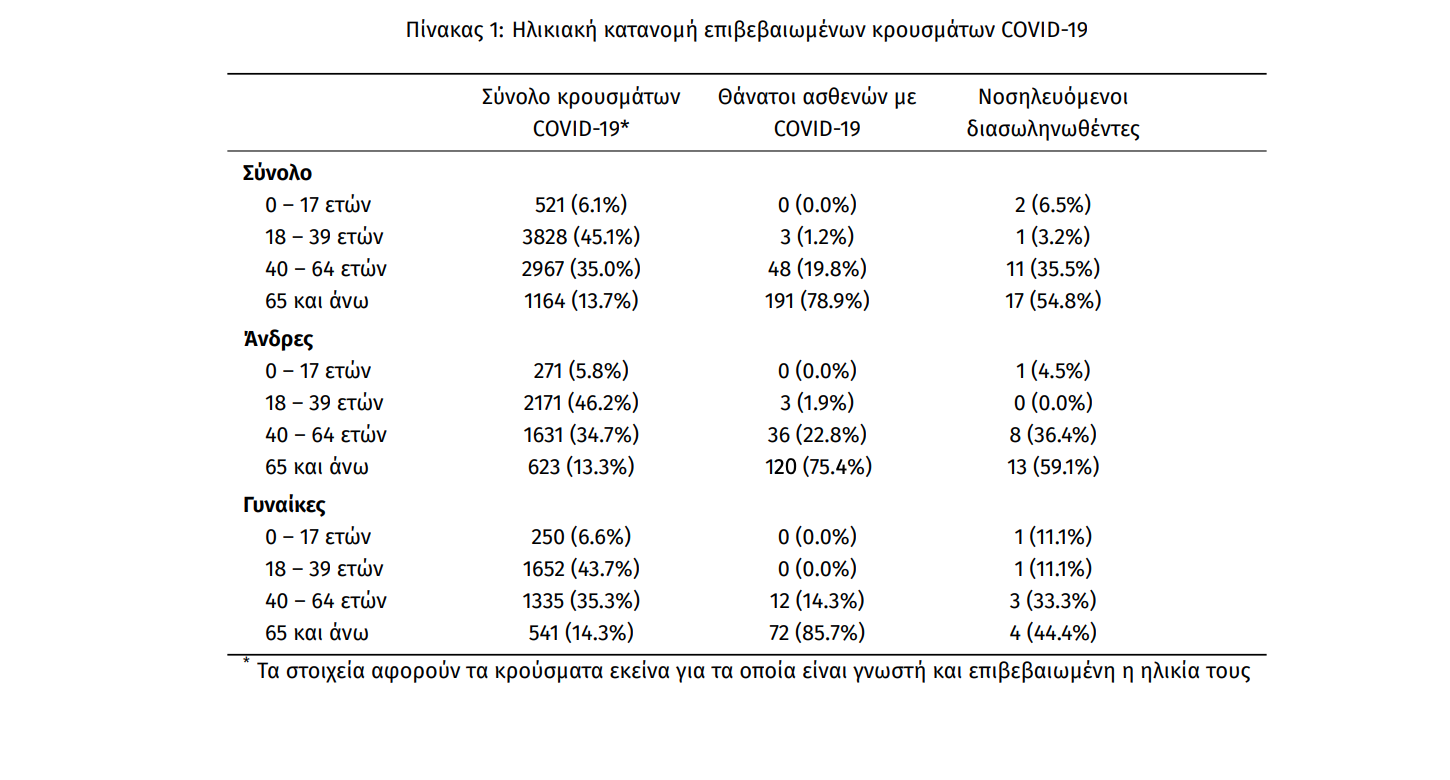 Τέλος, έχουμε 1 ακόμα καταγεγραμμένο θάνατο και 243 θανάτους συνολικά στη χώρα. 84 (34.7%) γυναίκες και οι υπόλοιποι άνδρες. Η διάμεση ηλικία των θανόντων συμπολιτών μας ήταν τα 77 έτη και το 94.6% είχε κάποιο υποκείμενο νόσημα ή/και ηλικία 70 ετών και άνω.