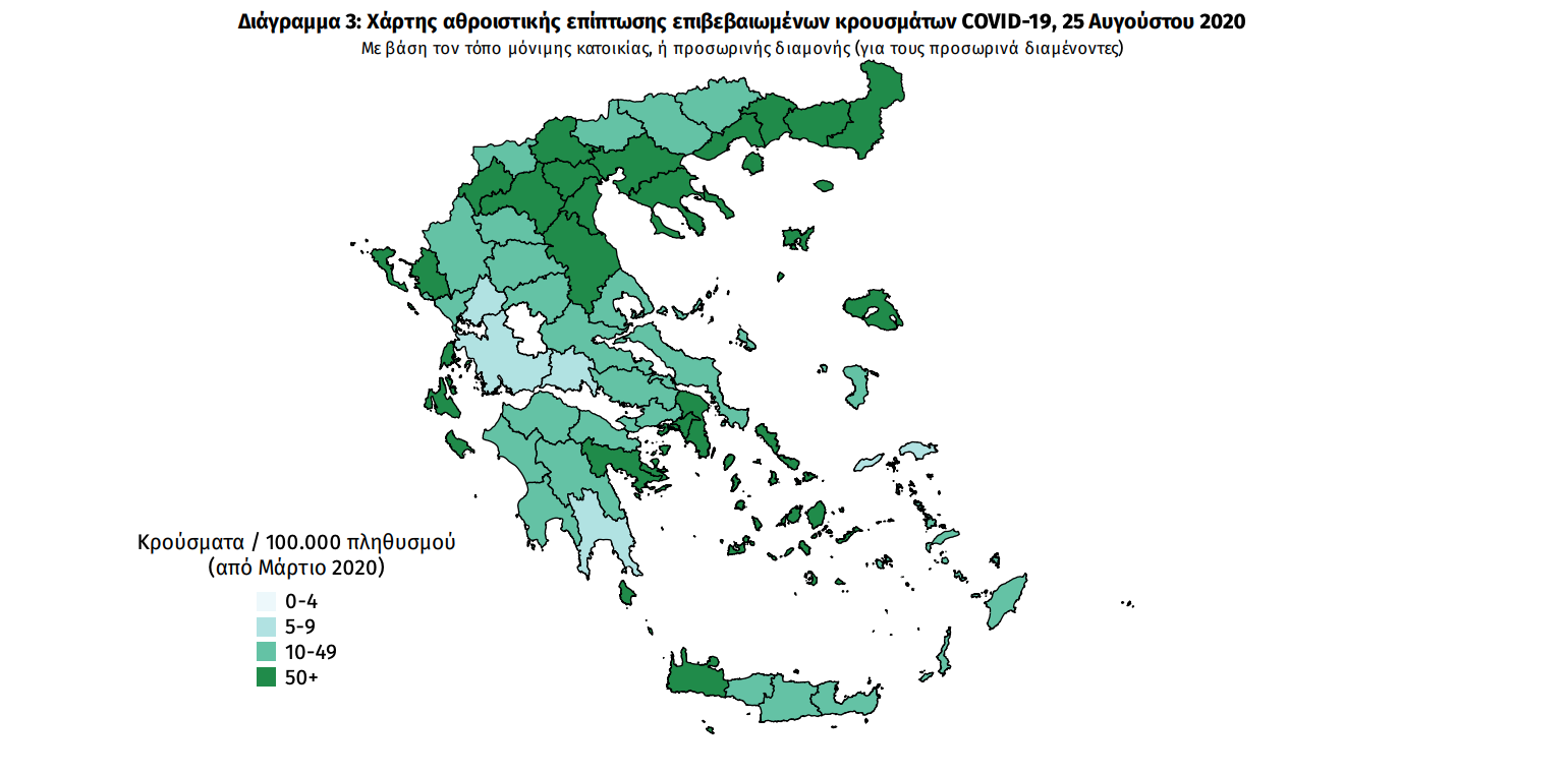 Ο χάρτης αποτυπώνει τη γεωγραφική κατανομή των συνολικών κρουσμάτων COVID-19 (από την αρχή της επιδημίας) ανά Περιφερειακή Ενότητα της χώρας, με βάση την δηλωθείσα διεύθυνση μόνιμης κατοικίας του ασθενούς, ή τη διεύθυνση προσωρινής διαμονής για τους τουρίστες και άλλους προσωρινά διαμένοντες στην Ελλάδα. Συμπεριλαμβάνονται τόσο κρούσματα με ιστορικό ταξιδίου (“εισαγόμενα”) όσο και κρούσματα με πιθανή εγχώρια μετάδοση