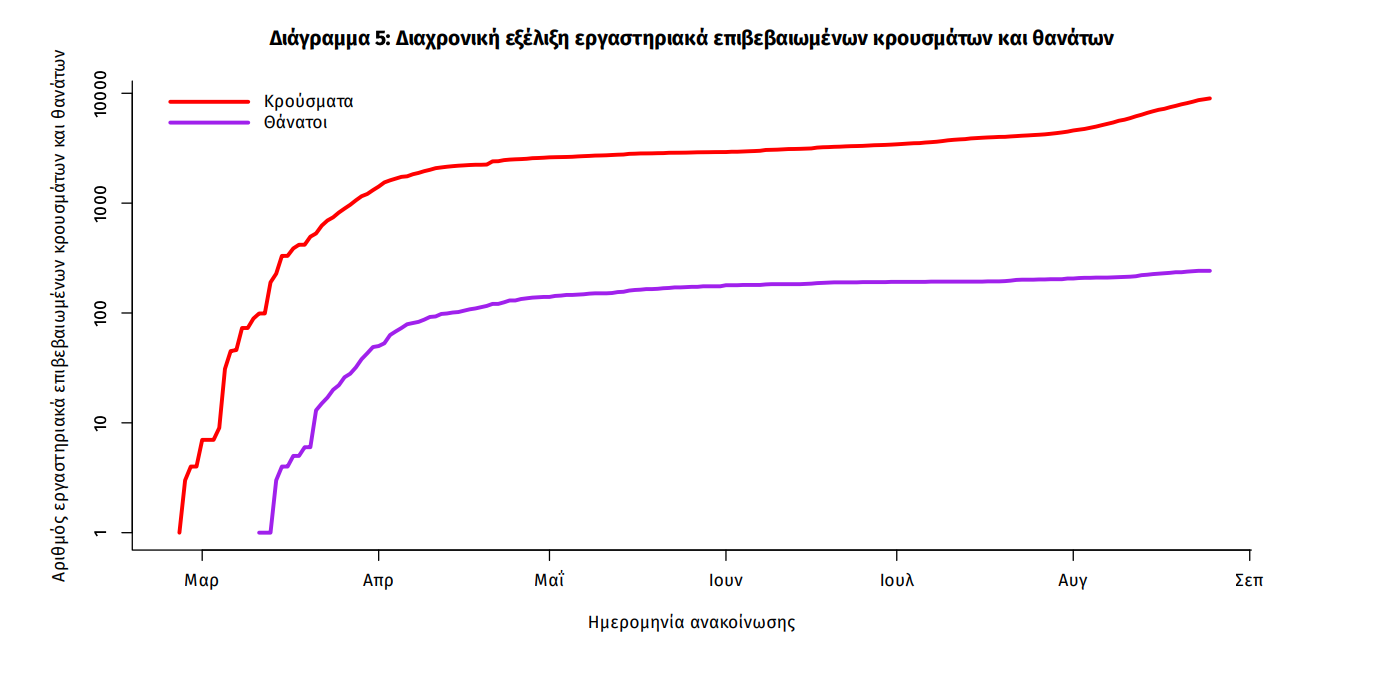 Η διαχρονική εξέλιξη των συνολικών κρουσμάτων και συνολικού αριθμού των θανάτων ασθενών COVID-19 παρουσιάζεται στο ακόλουθο διάγραμμα (σε λογαριθμική κλίμακα).