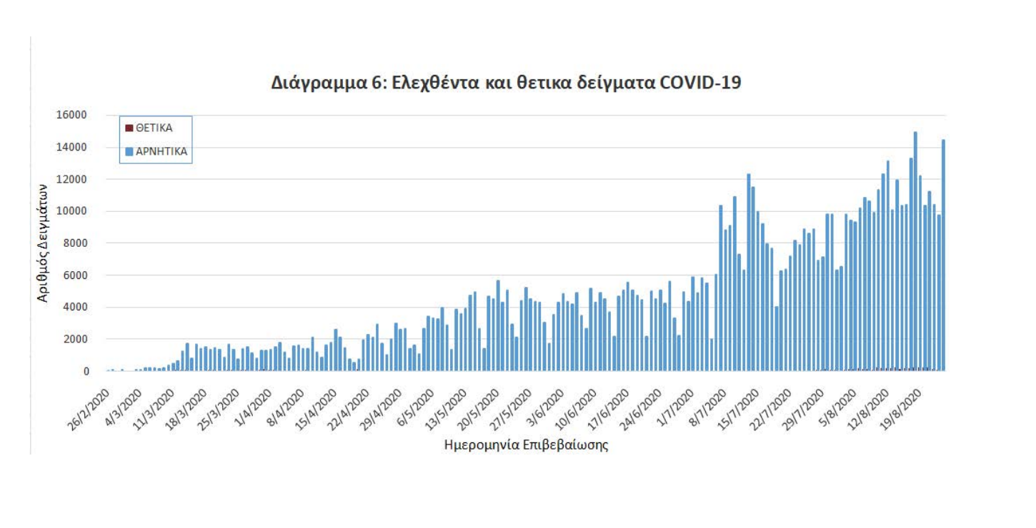 Δείγματα που έχουν ελεγχθεί στα συνεργαζόμενα με τον ΕΟΔΥ εργαστήρια: Από την 1η Ιανουαρίου 2020 μέχρι σήμερα, στα εργαστήρια που διενεργούν ελέγχους για τον νέο κορωνοϊό (SARS-CoV-2) και που δηλώνουν συστηματικά στον ΕΟΔΥ το σύνολο των δειγμάτων που ελέγχουν (θετικά και αρνητικά), έχουν συνολικά ελεγχθεί 872550 κλινικά δείγματα, εκ των οποίων τα 9668(1.1%) ήταν θετικά στον κορωνοϊό (συμπεριλαμβάνονται και περισσότερα από ένα δείγματα ανά άτομο που ελέγχθηκε).