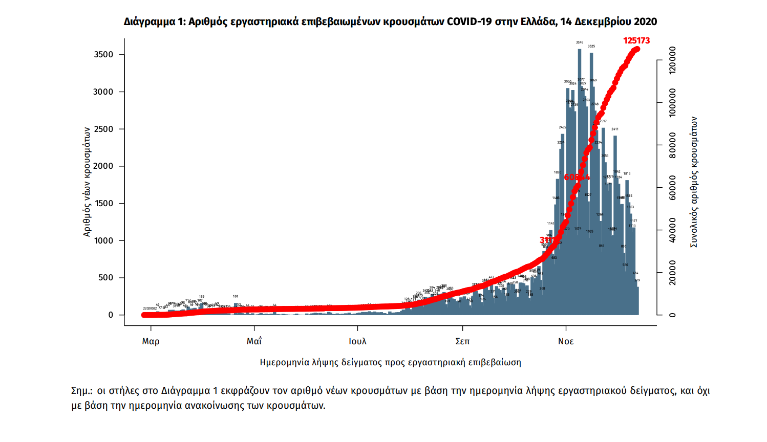 Ο συνολικός αριθμός των κρουσμάτων ανέρχεται σε 125173 (ημερήσια μεταβολή +0.5%), εκ των οποίων 52.6% άνδρες. Οι νέοι θάνατοι ασθενών με COVID-19 είναι 62, ενώ από την έναρξη της επιδημίας έχουν καταγραφεί συνολικά 3687 θάνατοι.Η διάμεση ηλικία των ασθενών που απεβίωσαν είναι 79 έτη. Ο αριθμός των ασθενών που νοσηλεύονται διασωληνωμένοι είναι 558 (70.3% άνδρες). Η ημερήσια κατανομή των επιβεβαιωμένων κρουσμάτων είναι η ακόλουθη (η γραμμή παριστάνει την συνολική, αθροιστική κατανομή των κρουσμάτων).