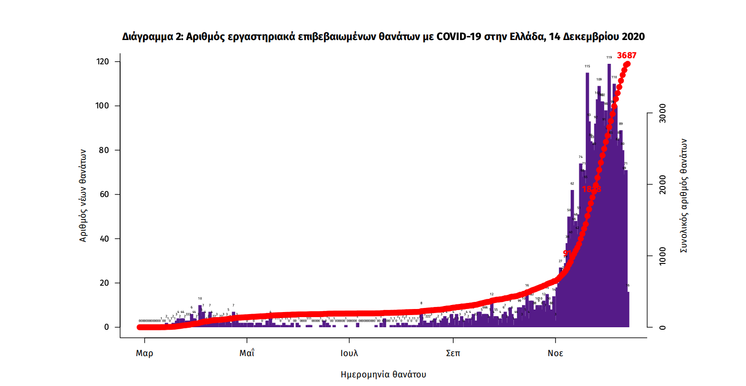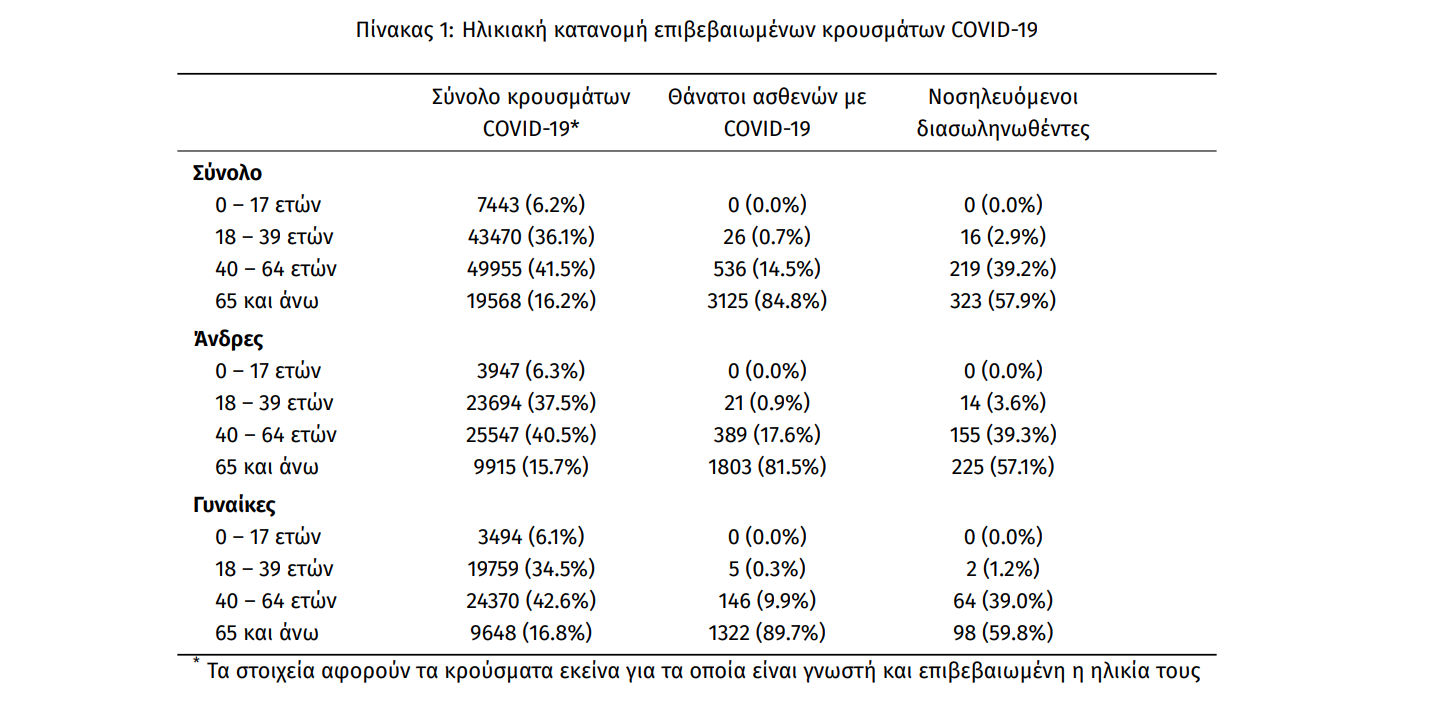 Τέλος, έχουμε 62 ακόμα καταγεγραμμένους θανάτους και 3687 θανάτους συνολικά στη χώρα. 1475 (40.0%) γυναίκες και οι υπόλοιποι άνδρες. Η διάμεση ηλικία των θανόντων συμπολιτών μας ήταν τα 79 έτη και το 95.7% είχε κάποιο υποκείμενο νόσημα ή/και ηλικία 70 ετών και άνω.