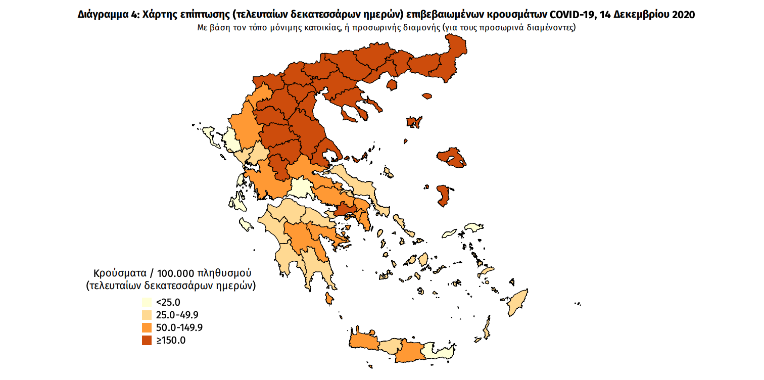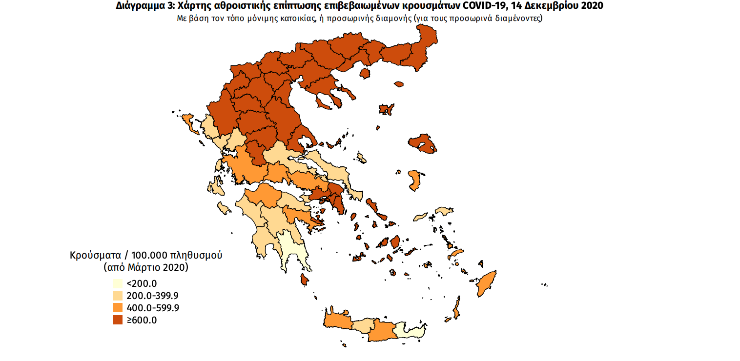 Γεωγραφική διασπορά Ο χάρτης αποτυπώνει τη γεωγραφική κατανομή των συνολικών κρουσμάτων COVID-19 (από την αρχή της επιδημίας) ανά Περιφερειακή Ενότητα της χώρας, με βάση την δηλωθείσα διεύθυνση μόνιμης κατοικίας του ασθενούς, ή τη διεύθυνση προσωρινής διαμονής για τους τουρίστες και άλλους προσωρινά διαμένοντες στην Ελλάδα. Συμπεριλαμβάνονται τόσο κρούσματα με ιστορικό ταξιδίου (“εισαγόμενα”) όσο και κρούσματα με πιθανή εγχώρια μετάδοση.