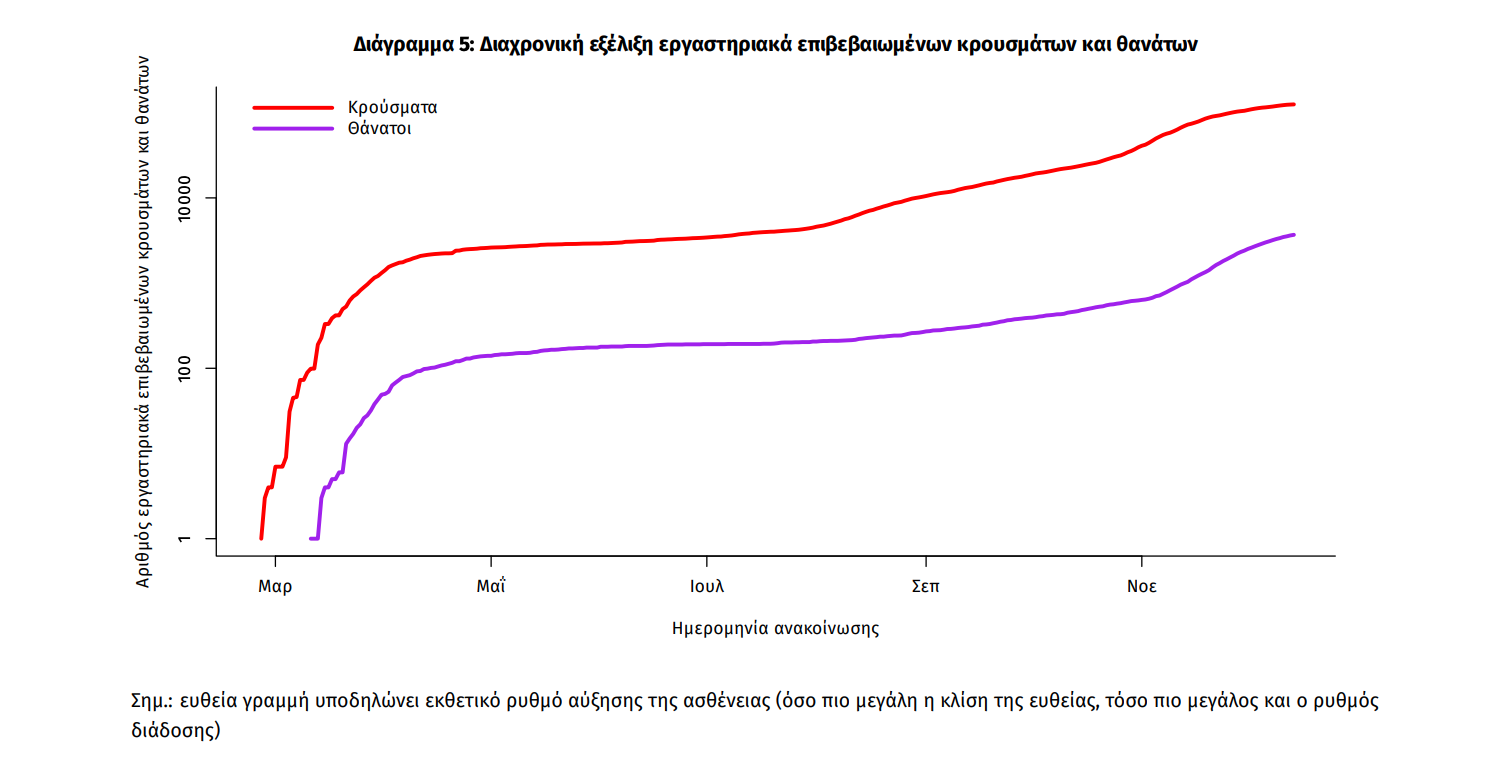 Η διαχρονική εξέλιξη των συνολικών κρουσμάτων και συνολικού αριθμού των θανάτων ασθενών COVID-19 παρουσιάζεται στο ακόλουθο διάγραμμα (σε λογαριθμική κλίμακα).