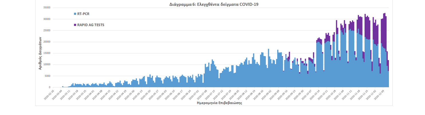 Δείγματα που έχουν ελεγχθεί: Από την 1η Ιανουαρίου 2020 μέχρι σήμερα, στα εργαστήρια που διενεργούν ελέγχους για τον νέο κορωνοϊό (SARS-CoV-2) και που δηλώνουν συστηματικά στον ΕΟΔΥ το σύνολο των δειγμάτων που ελέγχουν, έχουν συνολικά ελεγχθεί 2589438 κλινικά δείγματα ενώ από Μονάδες Υγείας και Κλιμάκια του ΕΟΔΥ που διενεργούν ελέγχους Rapid Ag έχουν ελεγχθεί 349377 δείγματα