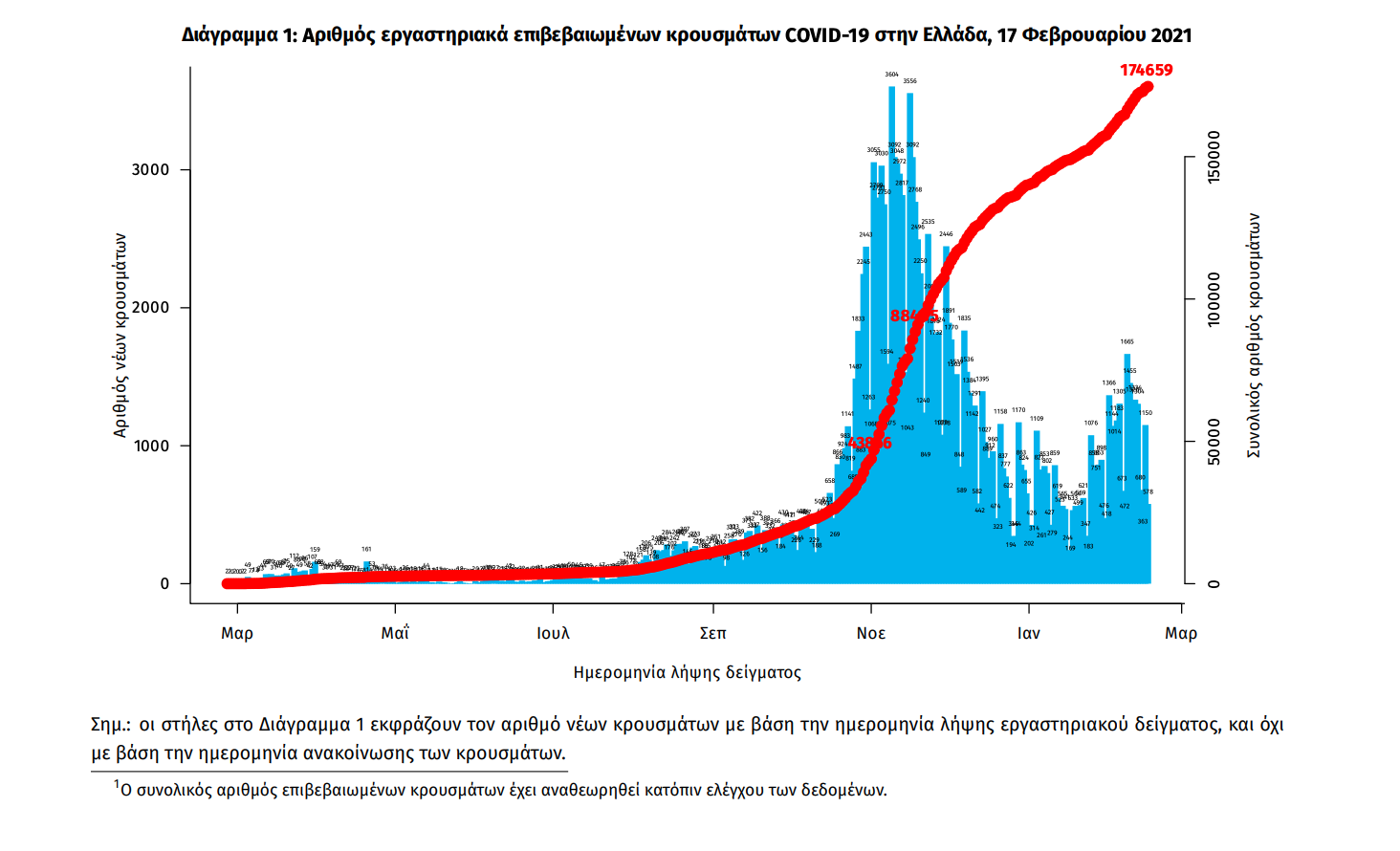 Τα νέα εργαστηριακά επιβεβαιωμένα κρούσματα της νόσου που καταγράφηκαν τις τελευταίες 24 ώρες είναι 755, εκ των οποίων 9 εντοπίστηκαν κατόπιν ελέγχων στις πύλες εισόδου της χώρας. Ο συνολικός αριθμός των κρουσμάτων ανέρχεται σε 174659 (ημερήσια μεταβολή +0.4%), εκ των οποίων 51.8% άνδρες. 1 Με βάση τα επιβεβαιωμένα κρούσματα των τελευταίων 7 ημερών, 52 θεωρούνται σχετιζόμενα με ταξίδι από το εξωτερικό και 1558 είναι σχετιζόμενα με ήδη γνωστό κρούσμα. To για την επικράτεια εκτιμάται σε 0.99 (95%Crl: 0.27-1.78) Ημερήσια εξέλιξη της πανδημίας: Η ημερήσια κατανομή των επιβεβαιωμένων κρουσμάτων είναι η ακόλουθη (η γραμμή παριστάνει την συνολική, αθροιστική κατανομή των κρουσμάτων).
