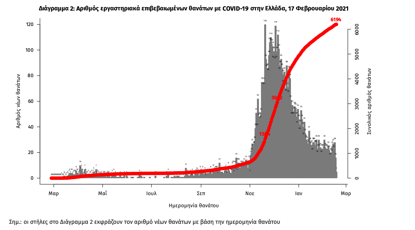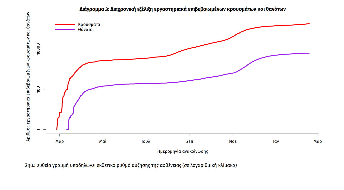 Η διαχρονική εξέλιξη των συνολικών κρουσμάτων και συνολικού αριθμού των θανάτων ασθενών COVID-19 παρουσιάζεται στο ακόλουθο διάγραμμα.