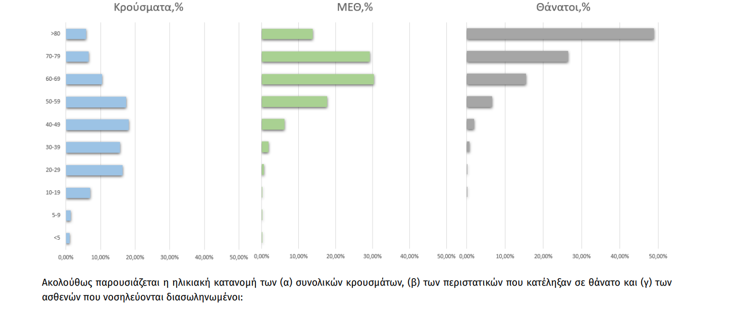Ακολούθως παρουσιάζεται η ηλικιακή κατανομή των (α) συνολικών κρουσμάτων, (β) των περιστατικών που κατέληξαν σε θάνατο και (γ) των ασθενών που νοσηλεύονται διασωληνωμένοι: