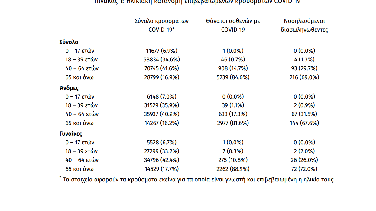 Ο αριθμός των ασθενών που νοσηλεύονται διασωληνωμένοι είναι 313 (67.7% άνδρες). Η διάμεση ηλικία τους είναι 70 έτη. To 86.9% έχει υποκείμενο νόσημα ή/και ηλικία 70 ετών και άνω. Από την αρχή της πανδημίας έχουν εξέλθει από τις ΜΕΘ 1246 ασθενείς. Οι νέες εισαγωγές2 ασθενών Covid-19 στα νοσοκομεία της επικράτειας είναι 211 (ημερήσια μεταβολή +11,05%). Ο μέσος όρος εισαγωγών του επταημέρου είναι 223 ασθενείς. Hλικιακή κατανομή:Η διάμεση ηλικία των κρουσμάτων είναι 44 έτη (εύρος 0.2 έως 105 έτη), ενώ η διάμεση ηλικία των θανόντων είναι 79 έτη (εύρος 15 έως 103 έτη)