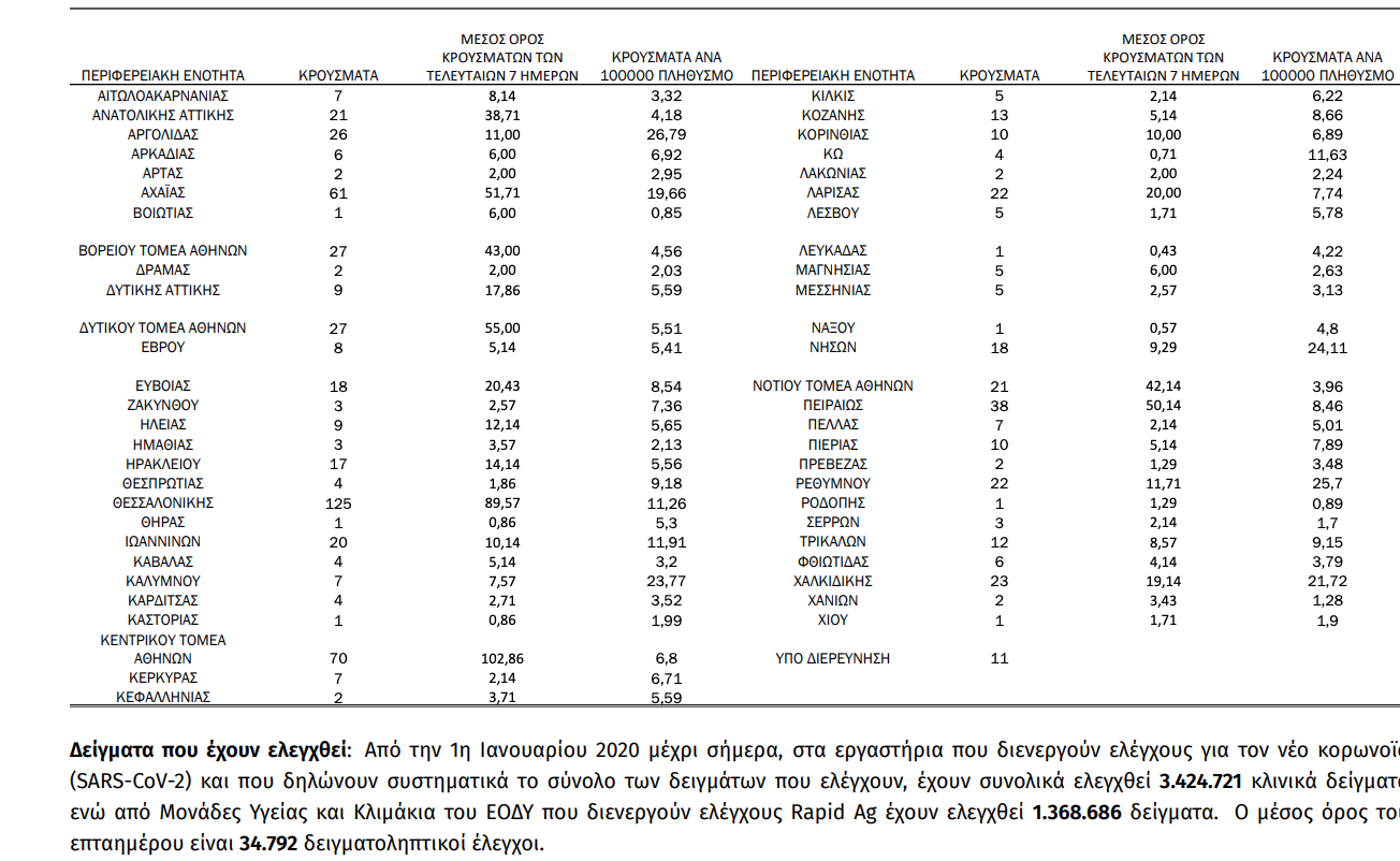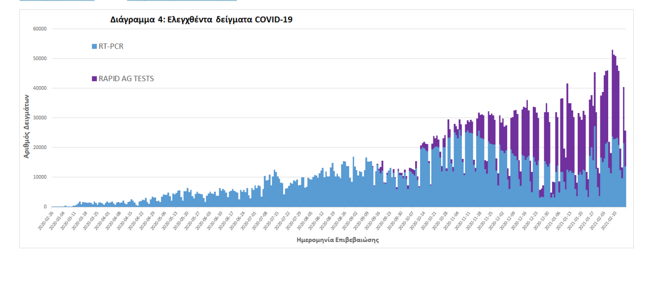 Δείγματα που έχουν ελεγχθεί: Από την 1η Ιανουαρίου 2020 μέχρι σήμερα, στα εργαστήρια που διενεργούν ελέγχους για τον νέο κορωνοϊό (SARS-CoV-2) και που δηλώνουν συστηματικά το σύνολο των δειγμάτων που ελέγχουν, έχουν συνολικά ελεγχθεί 3.424.721 κλινικά δείγματα ενώ από Μονάδες Υγείας και Κλιμάκια του ΕΟΔΥ που διενεργούν ελέγχους Rapid Ag έχουν ελεγχθεί 1.368.686 δείγματα. O μέσος όρος του επταημέρου είναι 34.792 δειγματοληπτικοί έλεγχοι.