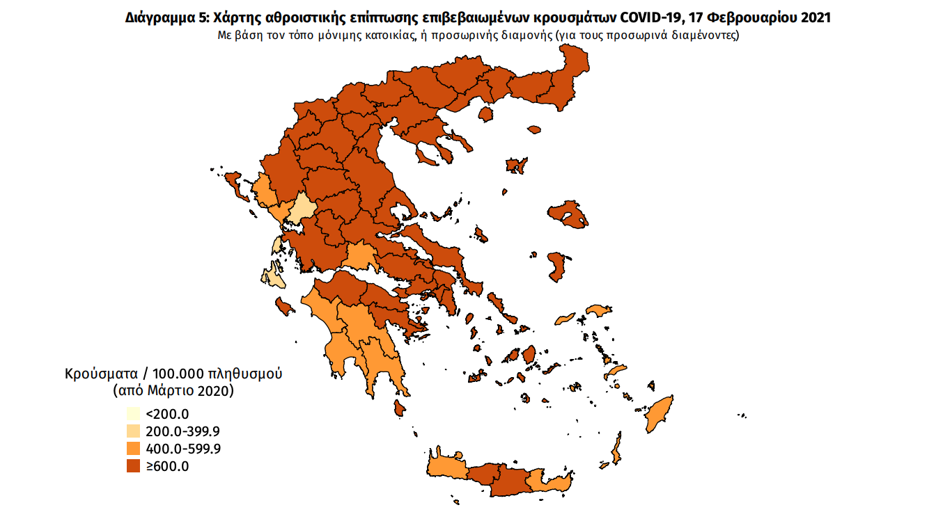 Γεωγραφική διασπορά: Ο χάρτης αποτυπώνει τη γεωγραφική κατανομή των συνολικών κρουσμάτων COVID-19 (από την αρχή της επιδημίας) ανά Περιφερειακή Ενότητα της χώρας, με βάση την δηλωθείσα διεύθυνση μόνιμης κατοικίας του ασθενούς, ή τη διεύθυνση προσωρινής διαμονής για τους τουρίστες και άλλους προσωρινά διαμένοντες στην Ελλάδα. Συμπεριλαμβάνονται τόσο κρούσματα με ιστορικό ταξιδίου (“εισαγόμενα”) όσο και κρούσματα με πιθανή εγχώρια μετάδοση.