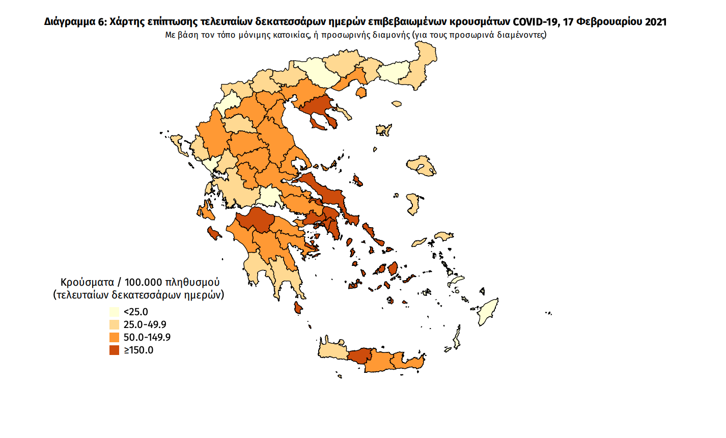 Κατανομή ανακοινωθέντων εγχώριων κρουσμάτων: Από το σύνολο των 755 νέων κρουσμάτων του νέου ιού στη χώρα 13 είναι εισαγόμενα εκ των οποίων 9 εντοπίστηκαν κατόπιν ελέγχων στις πύλες εισόδου της χώρας. Η κατανομή των 7423 νέων εγχώριων κρουσμάτων ανά Περιφερειακή Ενότητα παρουσιάζεται στον κατωτέρω πίνακα. Πίνακας 2: Ημερήσιος αριθμός και κρούσματα ανά 100.000 πληθυσμού επιβεβαιωμένων εγχώριων κρουσμάτων COVID-19 ανά περιφερειακή ενότητα στις 17 Φεβρουαρίου 2021