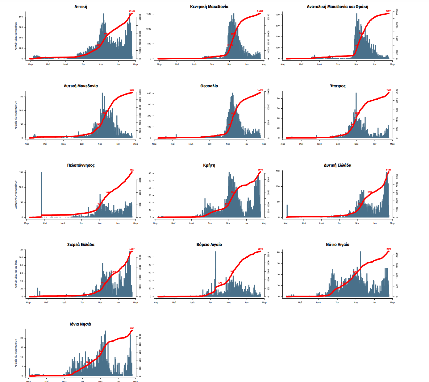 Παράρτημα 1: Επιδημικές καμπύλες κρουσμάτων COVID-19 με βάση την δηλωθείσα διεύθυνση μόνιμης κατοικίας του κρούσματος ή τη διεύθυνση προσωρινής διαμονής για τους τουρίστες και άλλους προσωρινά διαμένοντες στην Ελλάδα. Συμπεριλαμβάνονται τόσο κρούσματα με ιστορικό ταξιδίου όσο και κρούσματα με πιθανή εγχώρια μετάδοση.