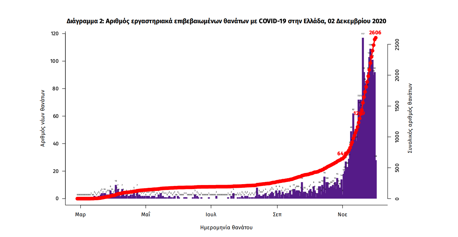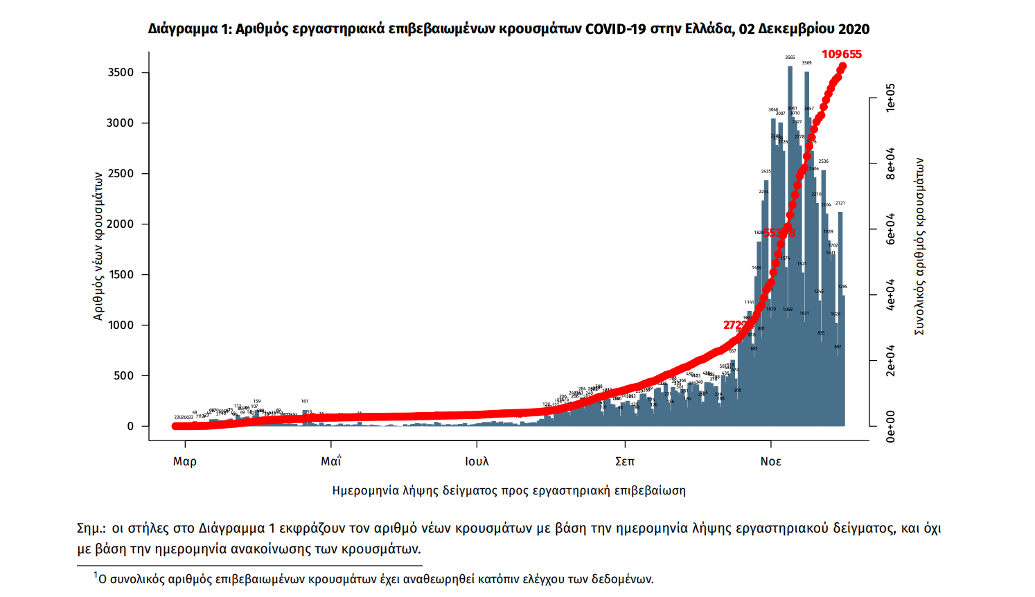 Τα στοιχεία που παρουσιάζονται αφορούν περιστατικά από την επιδημιολογική επιτήρηση της νόσου από το νέο κορωνοϊό (COVID19), με βάση τα δεδομένα που έχουν δηλωθεί στον ΕΟΔΥ και καταγραφεί μέχρι τις 02 Δεκεμβρίου 2020 (ώρα 15:00). Τα νέα εργαστηριακά επιβεβαιωμένα κρούσματα της νόσου είναι 2186, εκ των οποίων 28 εντοπίστηκαν κατόπιν ελέγχων στις πύλες εισόδου της χώρας.