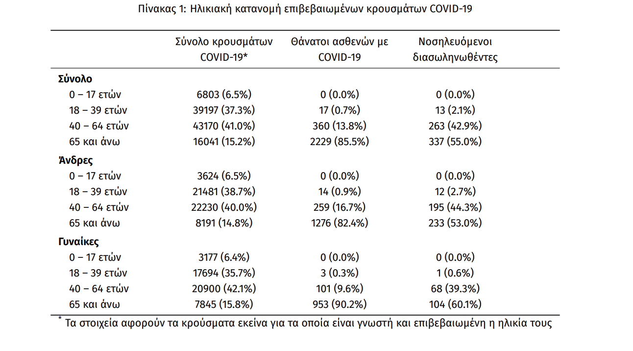 Τέλος, έχουμε 89 ακόμα καταγεγραμμένους θανάτους και 2606 θανάτους συνολικά στη χώρα. 1055 (40.5%) γυναίκες και οι υπόλοιποι άνδρες. Η διάμεση ηλικία των θανόντων συμπολιτών μας ήταν τα 80 έτη και το 96.6% είχε κάποιο υποκείμενο νόσημα ή/και ηλικία 70 ετών και άνω.